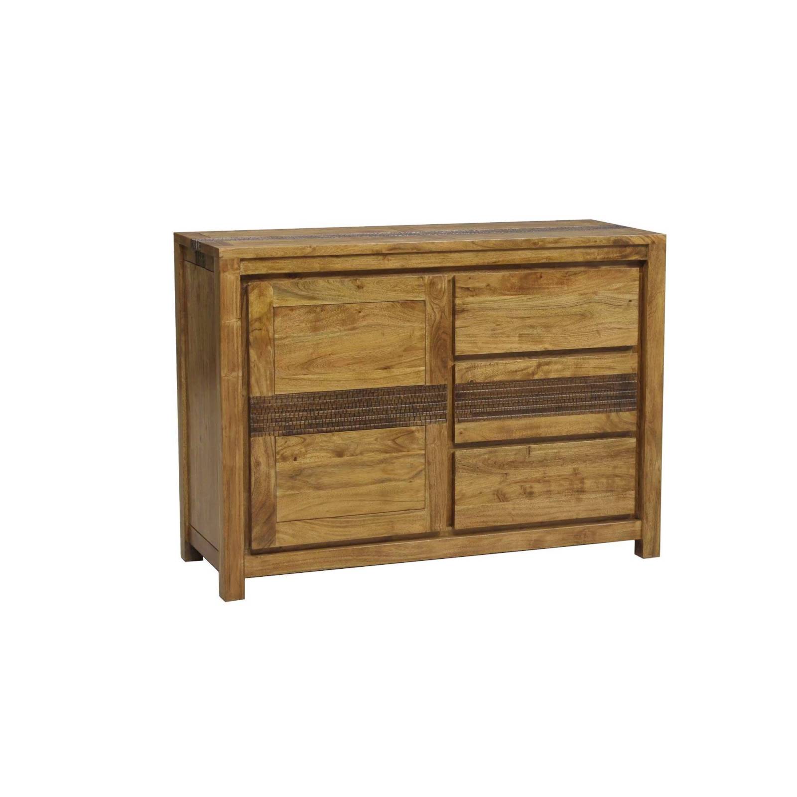 Doté d’une porte spacieuse et de trois tiroirs pratiques, le buffet Sépia offre un espace de rangement polyvalent pour la vaisselle, les accessoires du salon ou les objets du quotidien. Derrière la porte, une étagère intérieure robuste permet d’organiser facilement vos affaires. Le panneau arrière, l’étagère intérieure et les fonds de tiroirs sont réalisés en contreplaqué de qualité, garantissant légèreté et solidité.