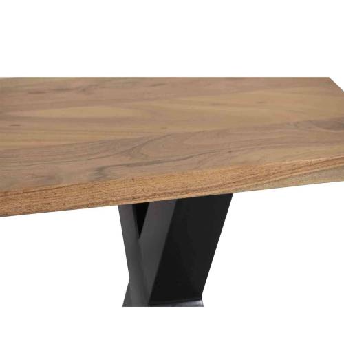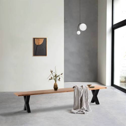 Le banc 240 cm fabriqué en acacia massif offre une assise généreuse, complétée par des pieds en X en acier qui ajoutent une touche contemporaine.