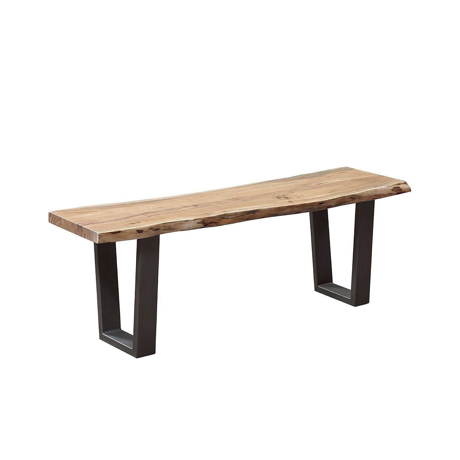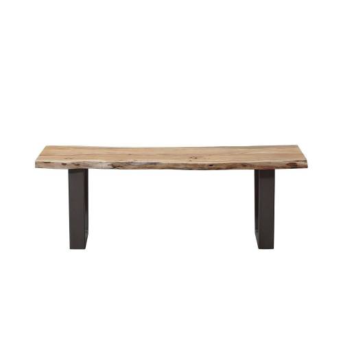 Reconnu pour sa résistance et la beauté de son veinage marbré, le bois d'acacia, produit et façonné en Inde, est particulièrement adapté à ce banc de couleur clair, aux bordures naturelles. On apprécie la symbiose des matériaux que tout oppose. Bois et métal ne font qu'un et offrent à l'ensemble une allure à la fois sobre et chaleureuse.
