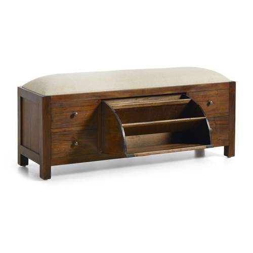 Astucieux, ce banc en acajou massif comporte un espace de rangement pour vos chaussures et pourra donc se substituer à un meuble à chaussures. Des tiroirs situés de part et d'autres vous permettront de ranger vos boîtes de cirage, votre chausse-pied ainsi que vos brosses et autres petits accessoires. Installé sur l'assise moelleuse de ce banc, vous pourrez mettre et enlever facilement vos chaussures. Voici donc le meuble d'entrée idéal !