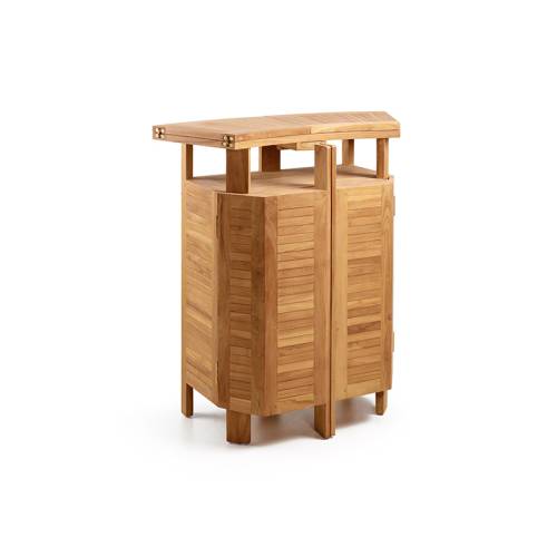 Ce beau bar de jardin en teck massif convient à une utilisation dans le jardin. On a tous imaginé un meuble bar conçu pour le jardin, avec ce bar en teck Greenwood, c'est désormais une réalité ! Ce bar pliant se ferme et s'ouvre en un tour de main. Il s'installe facilement sur une terrasse ou même sur la pelouse, en plein milieu de votre jardin. Son comptoir arrondi est pratique pour réunir plusieurs invités qui se délecteront de vos cocktails. N'oubliez pas d'acheter les chaises de bar en teck issues de la même collection !
