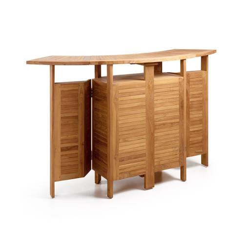 Le bois exotique a un charme vibrant, c'est indéniable ! Et que dire du teck… Il s'agit d'un des plus beaux bois exotiques, très apprécié pour fabriquer du mobilier de jardin comme ce comptoir bar d'extérieur. L'avantage du teck, c'est qu'il supporte la chaleur et le froid, même à des températures extrêmes. L'humidité ne lui fait pas peur puisqu'il contient une oléorésine l'empêchant de pourrir. L'entretien de ce bar en teck nécessite simplement une huile spéciale teck.