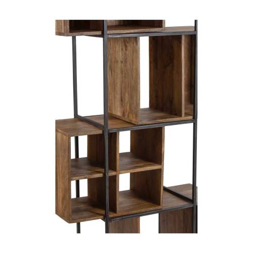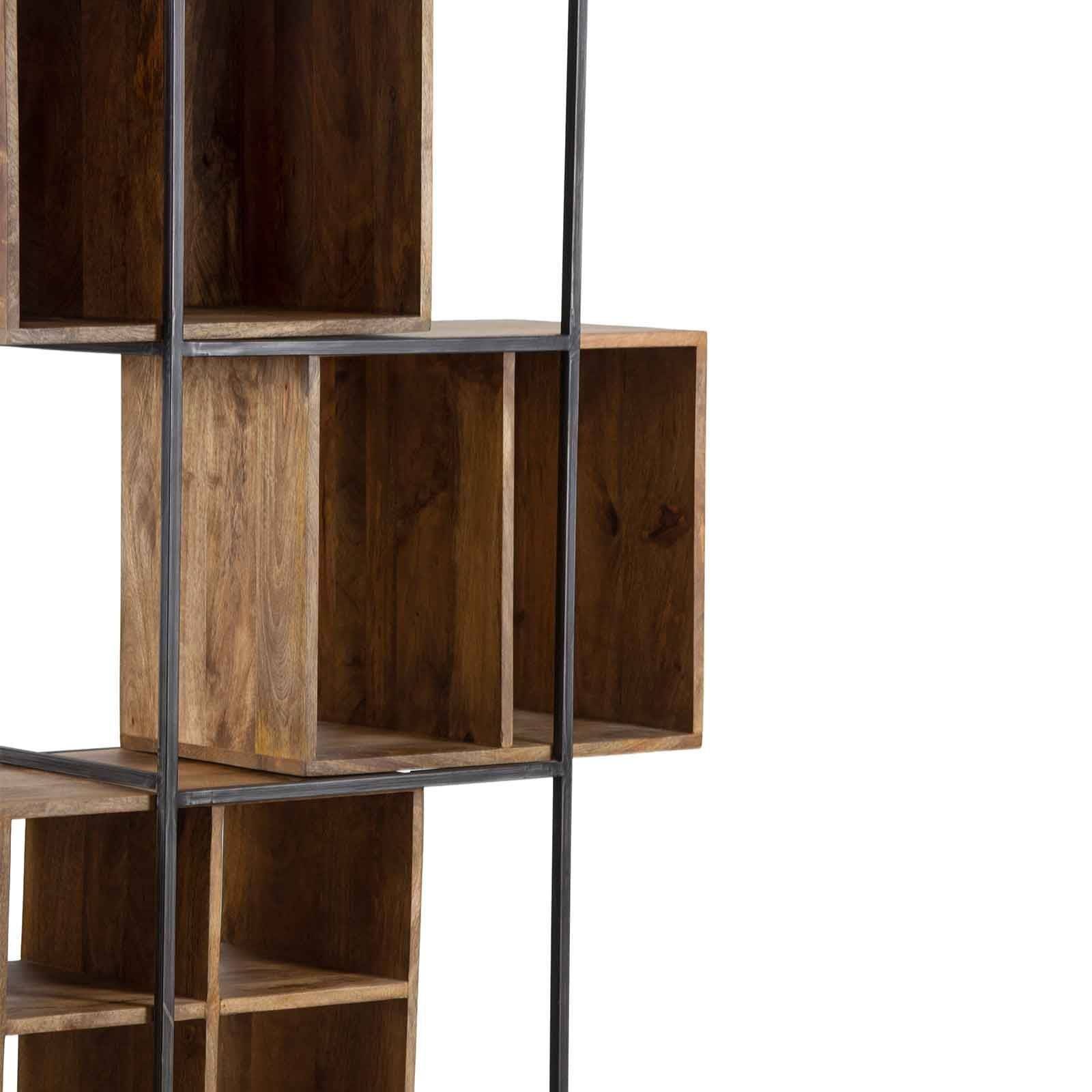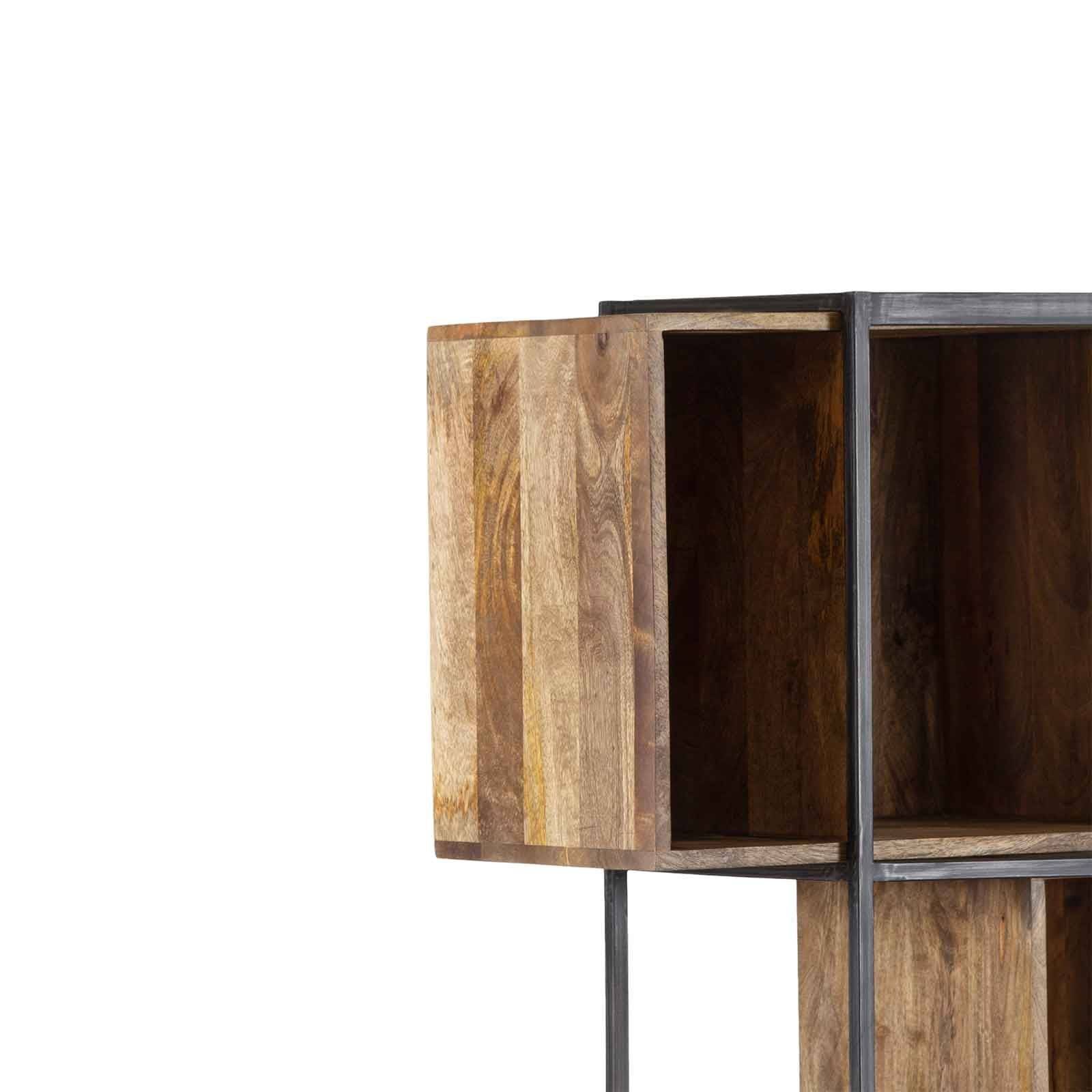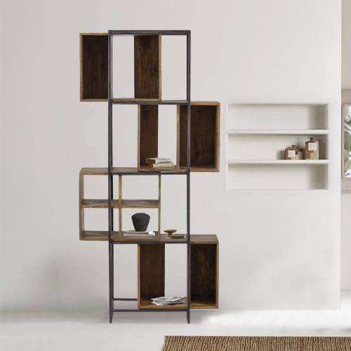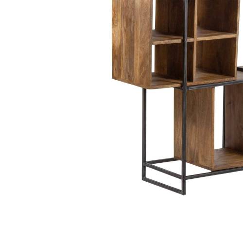 La bibliothèque 10 cases marie l'élégance du manguier massif avec la robustesse du métal industriel, créant ainsi un meuble fonctionnel et esthétique.