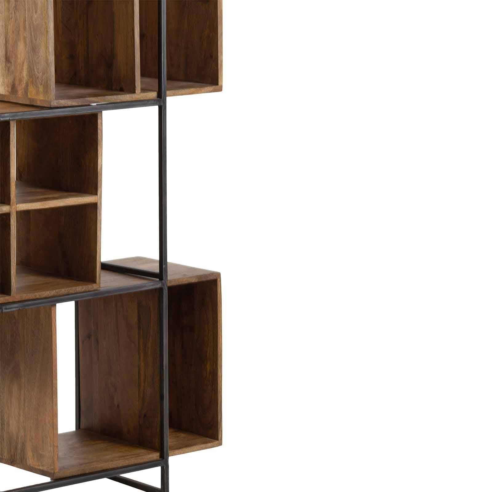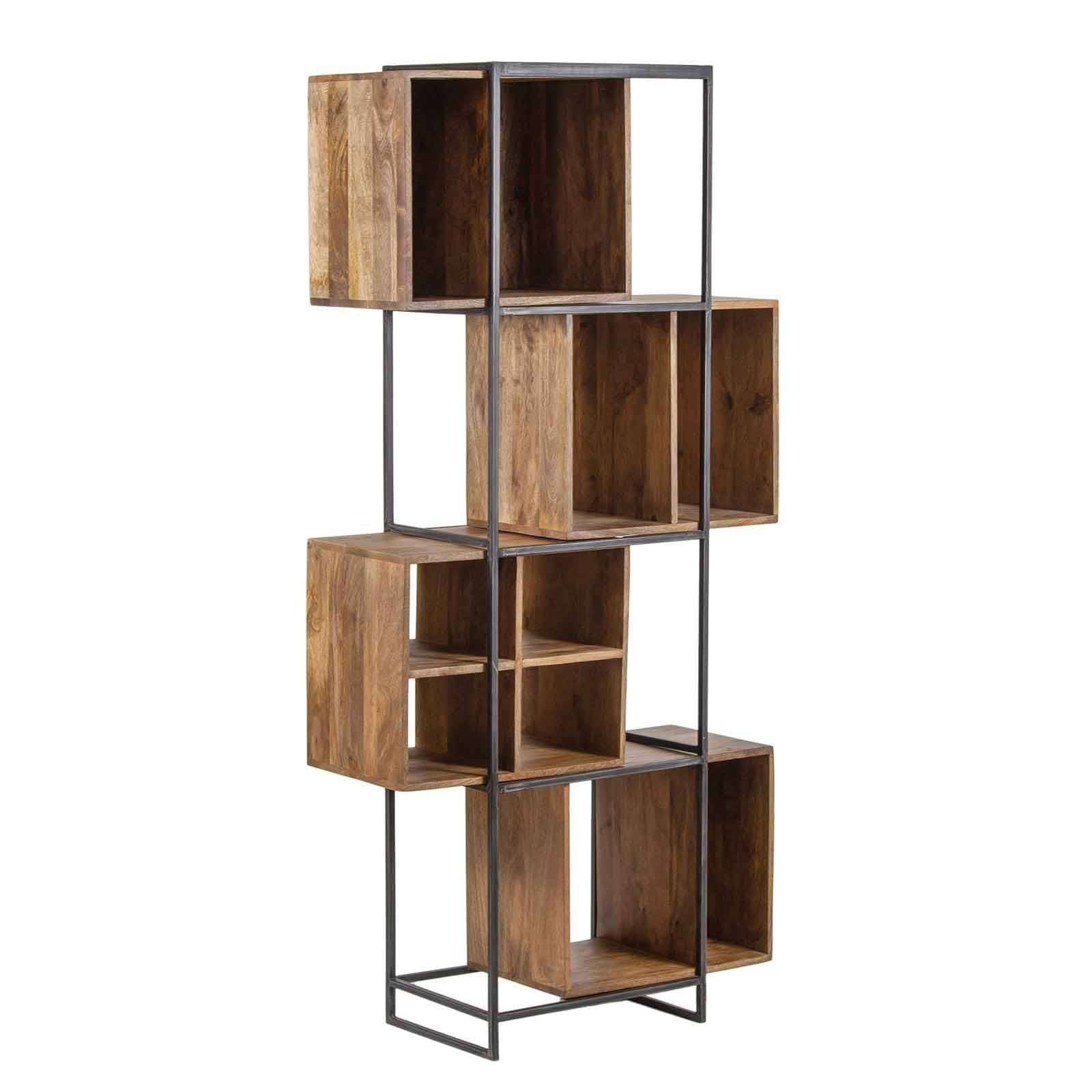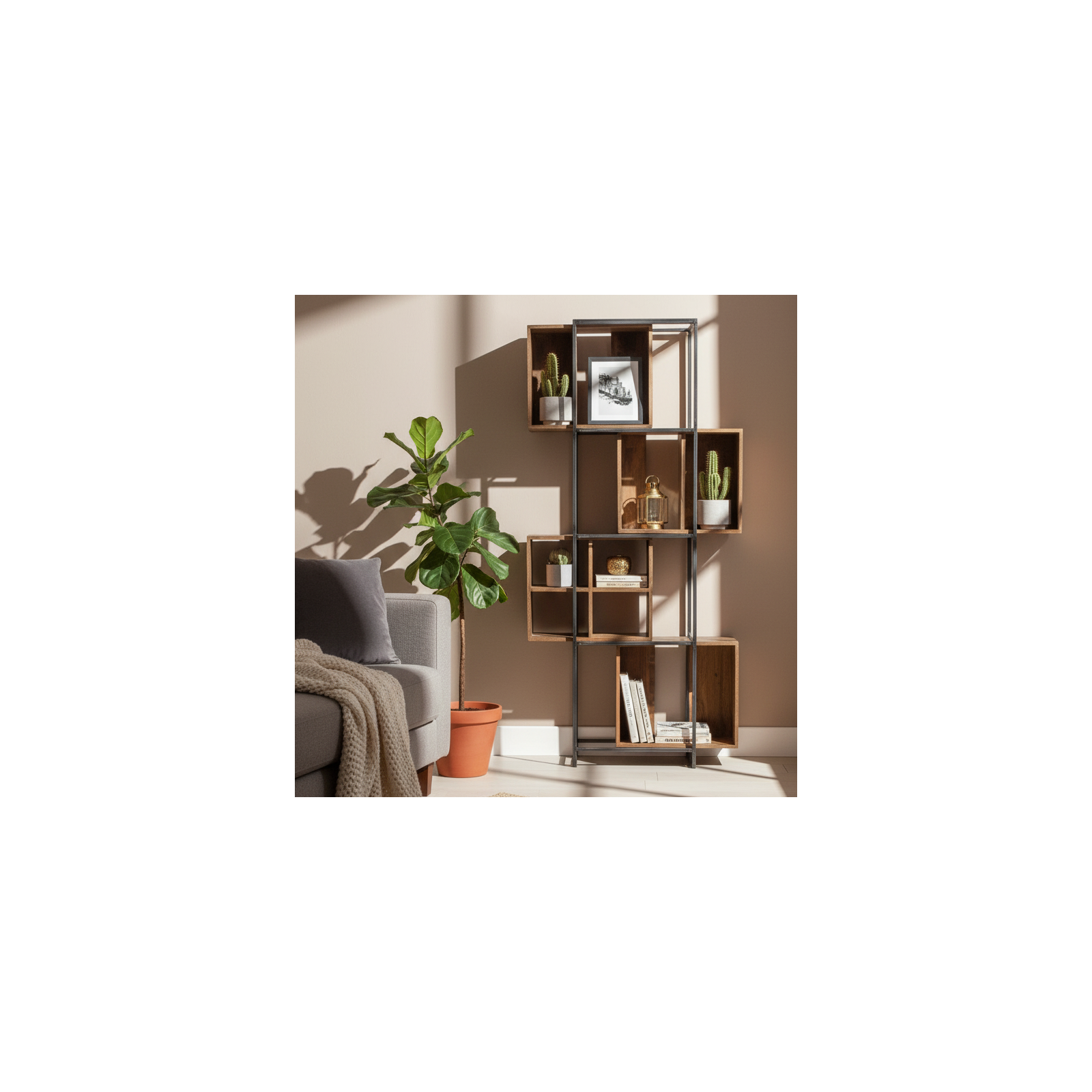 La bibliothèque 10 cases marie l'élégance du manguier massif avec la robustesse du métal industriel, créant ainsi un meuble fonctionnel et esthétique.