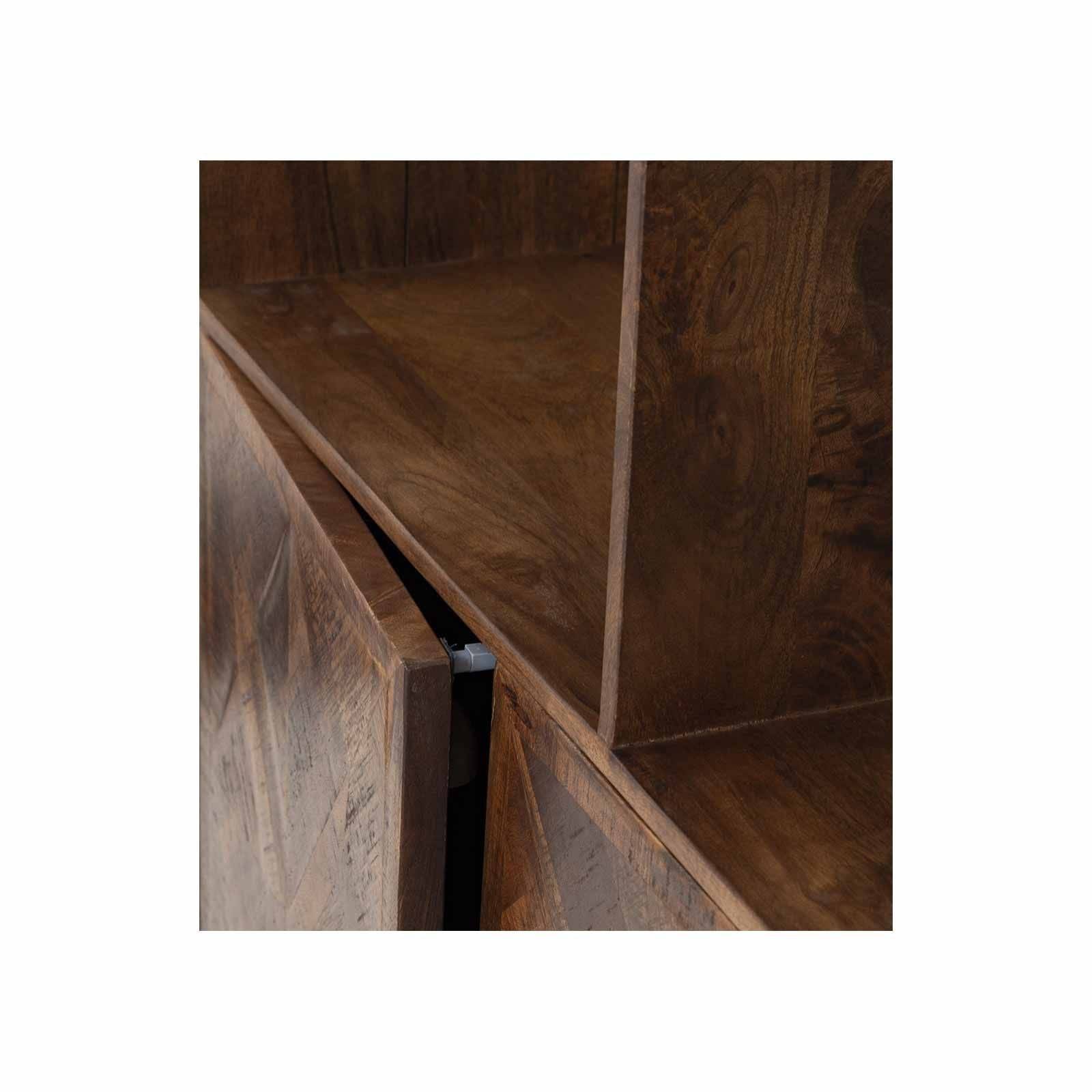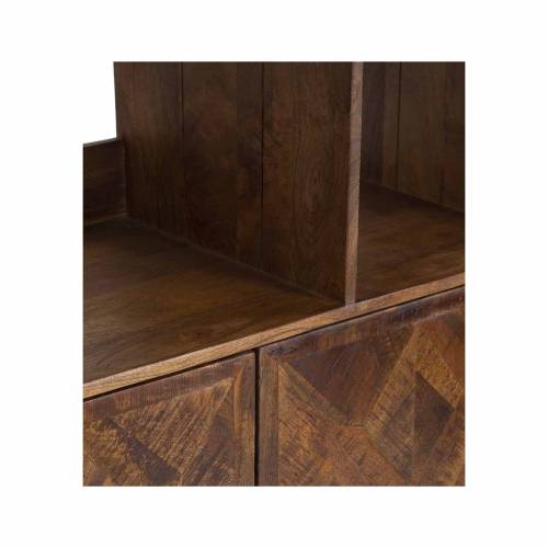 Que ce soit dans votre salon, votre bureau ou votre chambre à coucher, cette bibliothèque dont les portes sont un assemblage de pièces de bois façon marqueterie en chevrons ajoutera une touche d'élégance et de fonctionnalité à votre espace de vie. Exprimez votre style personnel tout en organisant votre espace de manière pratique avec la bibliothèque 2 portes 6 niches de la collection Manguier Caractère. Robuste, polyvalente et d'une beauté naturelle, elle deviendra rapidement le point central de votre intérieur.