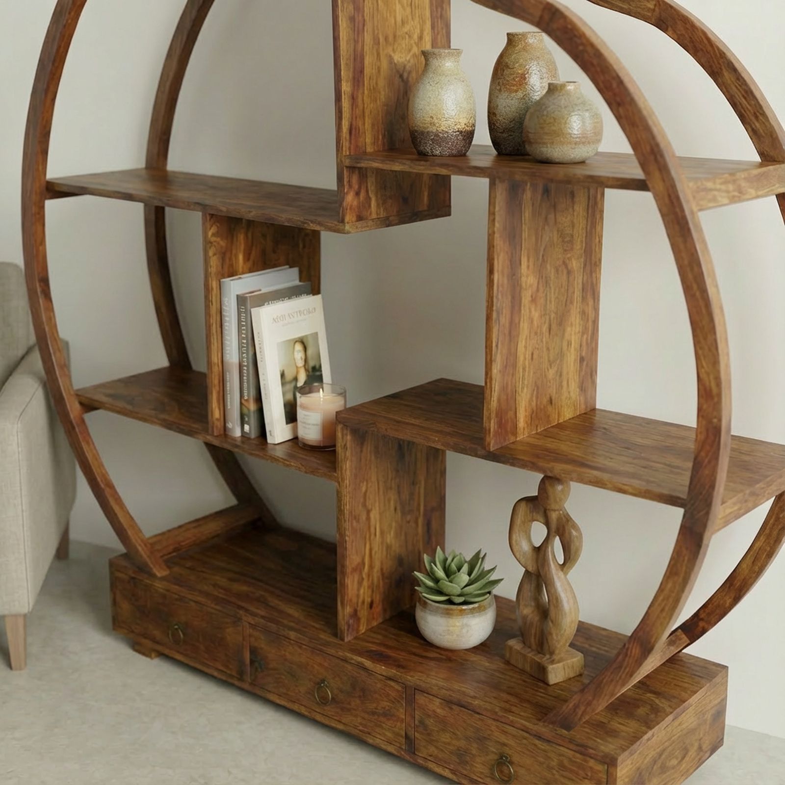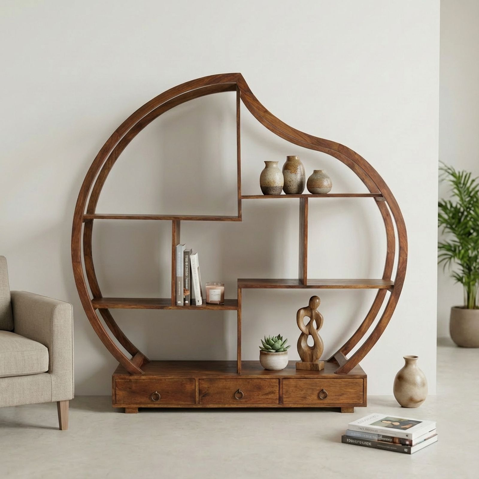Vous ne trouverez pas plus original que cette bibliothèque asymétrique ronde de la gamme Lhassa. Elle est entièrement composée de palissandre massif.