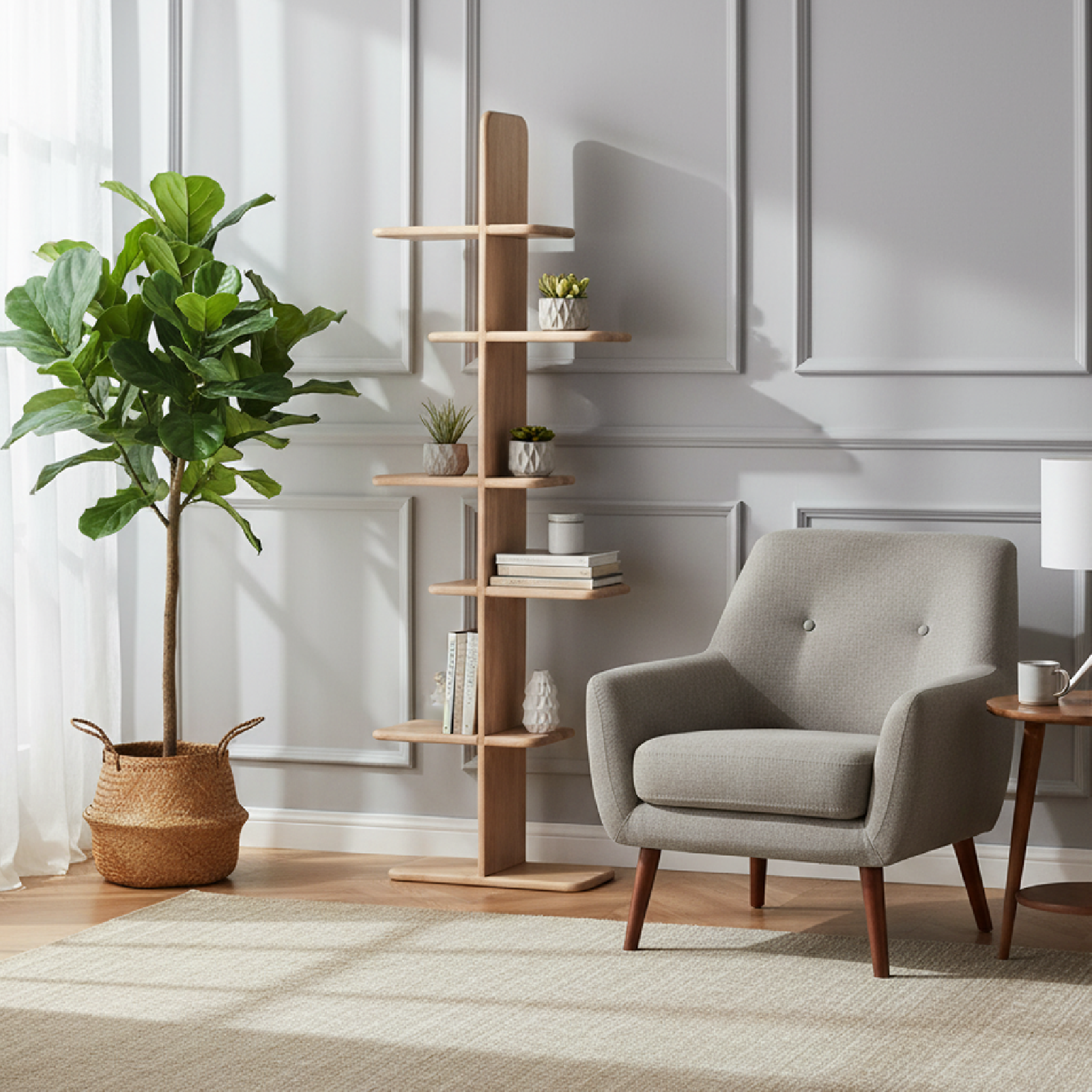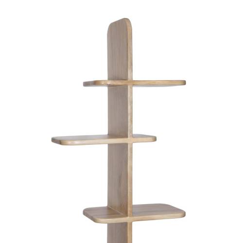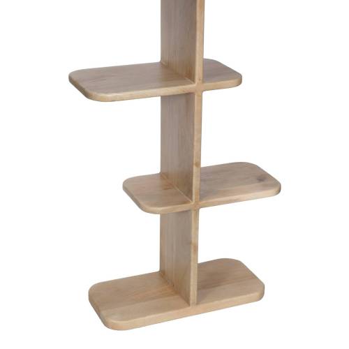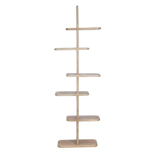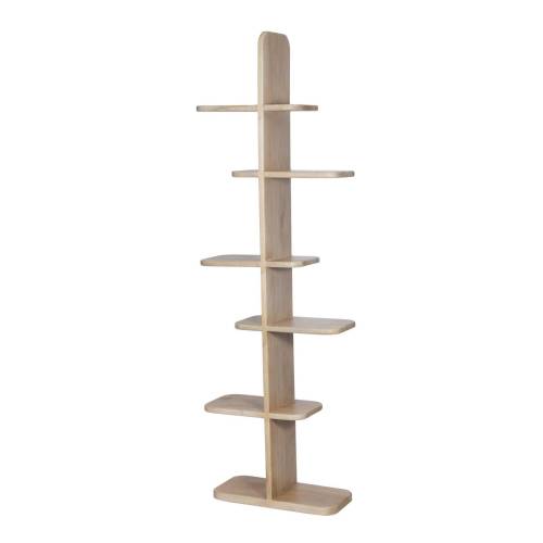 Son design vertical se compose d’une colonne centrale avec des étagères décalées en porte-à-faux, créant une silhouette visuellement saisissante au rythme équilibré. Chaque étagère, aux bords délicatement arrondis, est pensée pour accueillir livres, objets décoratifs ou essentiels du quotidien avec légèreté et élégance.