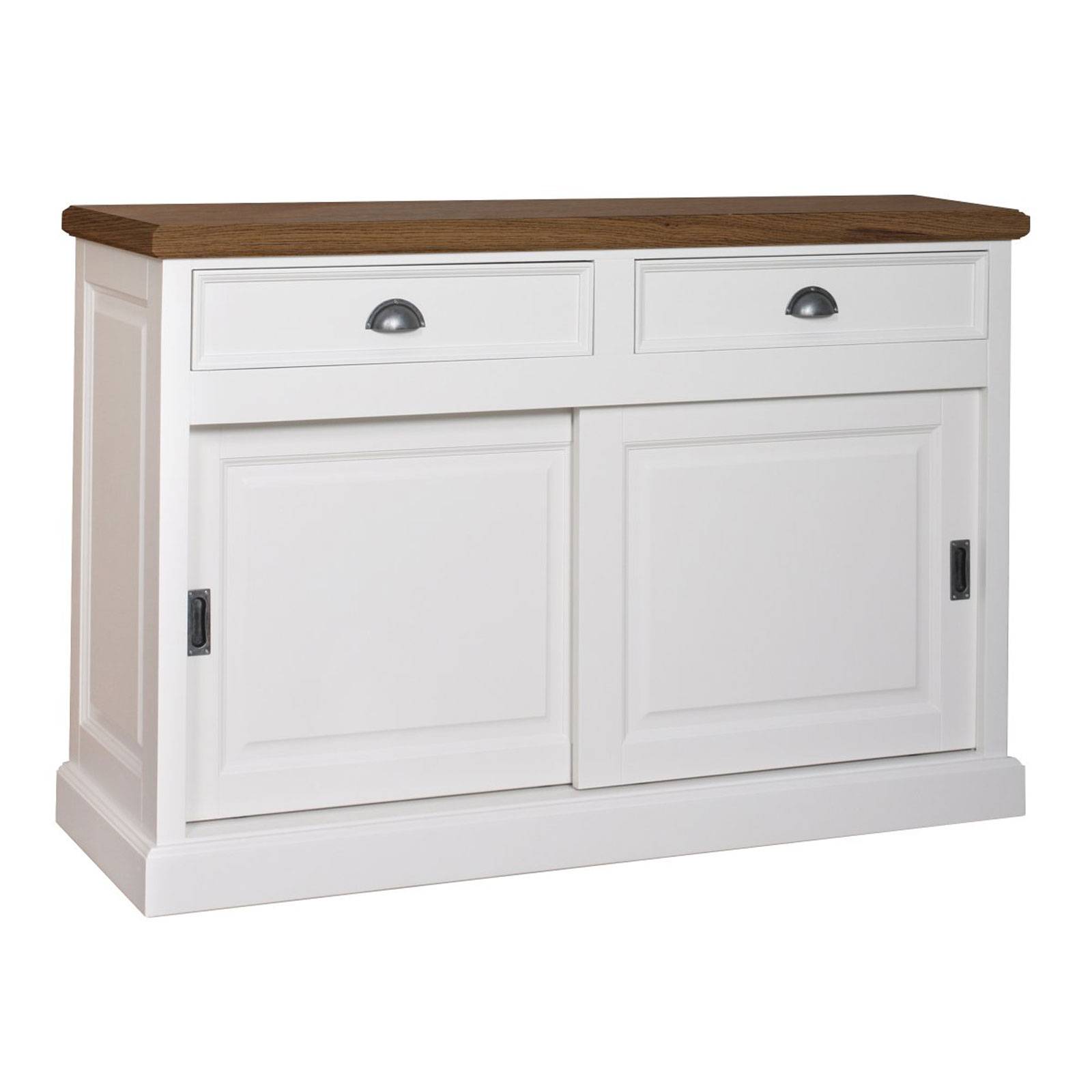 Présenté en blanc et en bois naturel, ce petit buffet bas s'autorise aussi une finition vieillie, parfaitement adaptée à votre ambiance shabby chic, charmante et délicate. Mais des teintes plus foncées sont également disponibles pour faire écho à vos aspirations contemporaines. Passe-partout, ce bahut deux portes, rehaussées de deux tiroirs, apportera un complément indispensable à votre organisation, tandis que son plateau en chêne, massif et chaleureux, vous donnera l'occasion de créer un décor soigné.