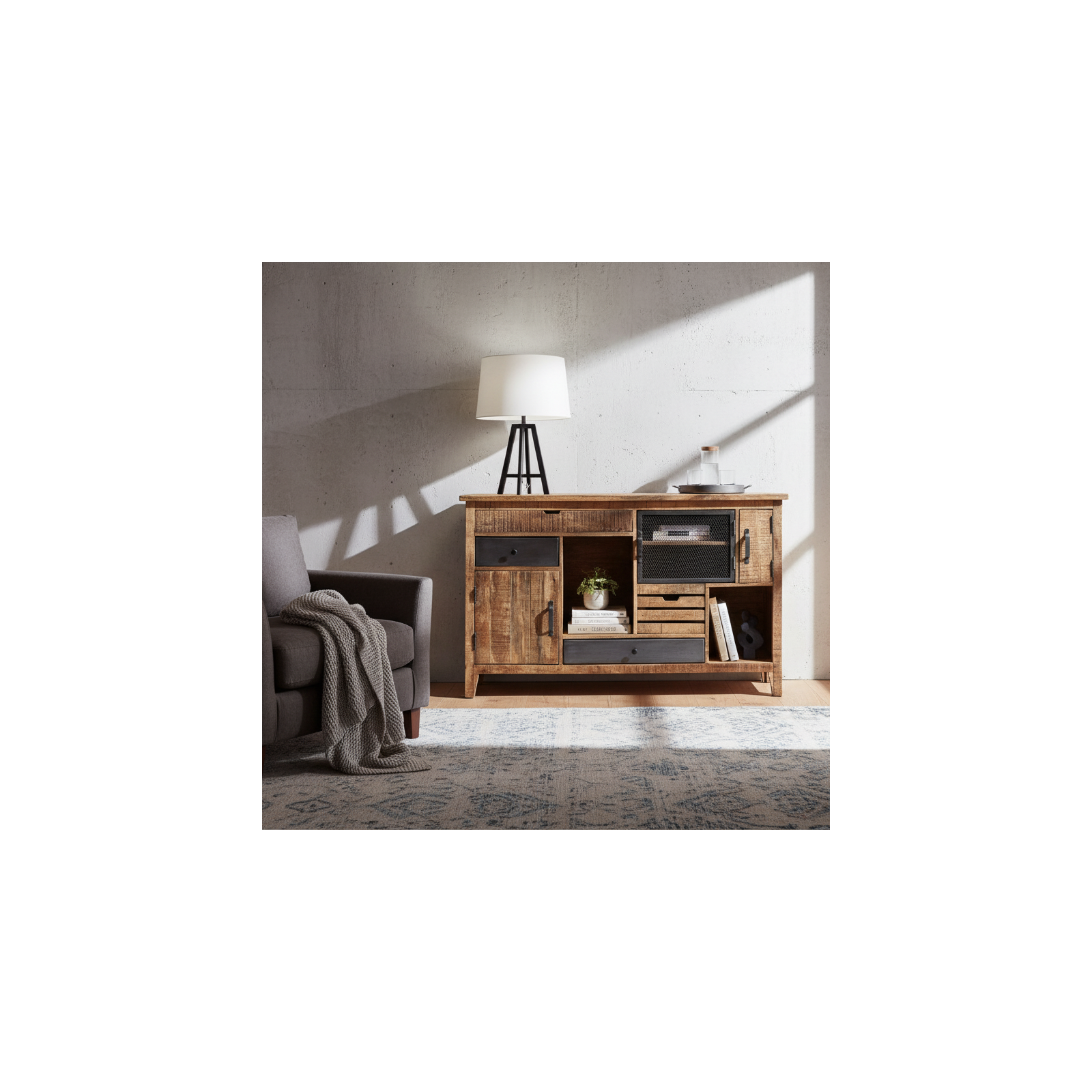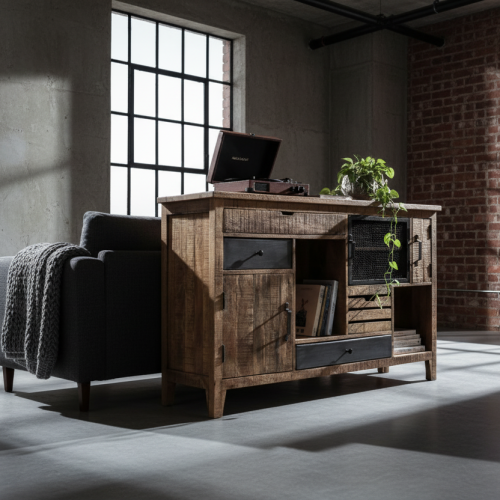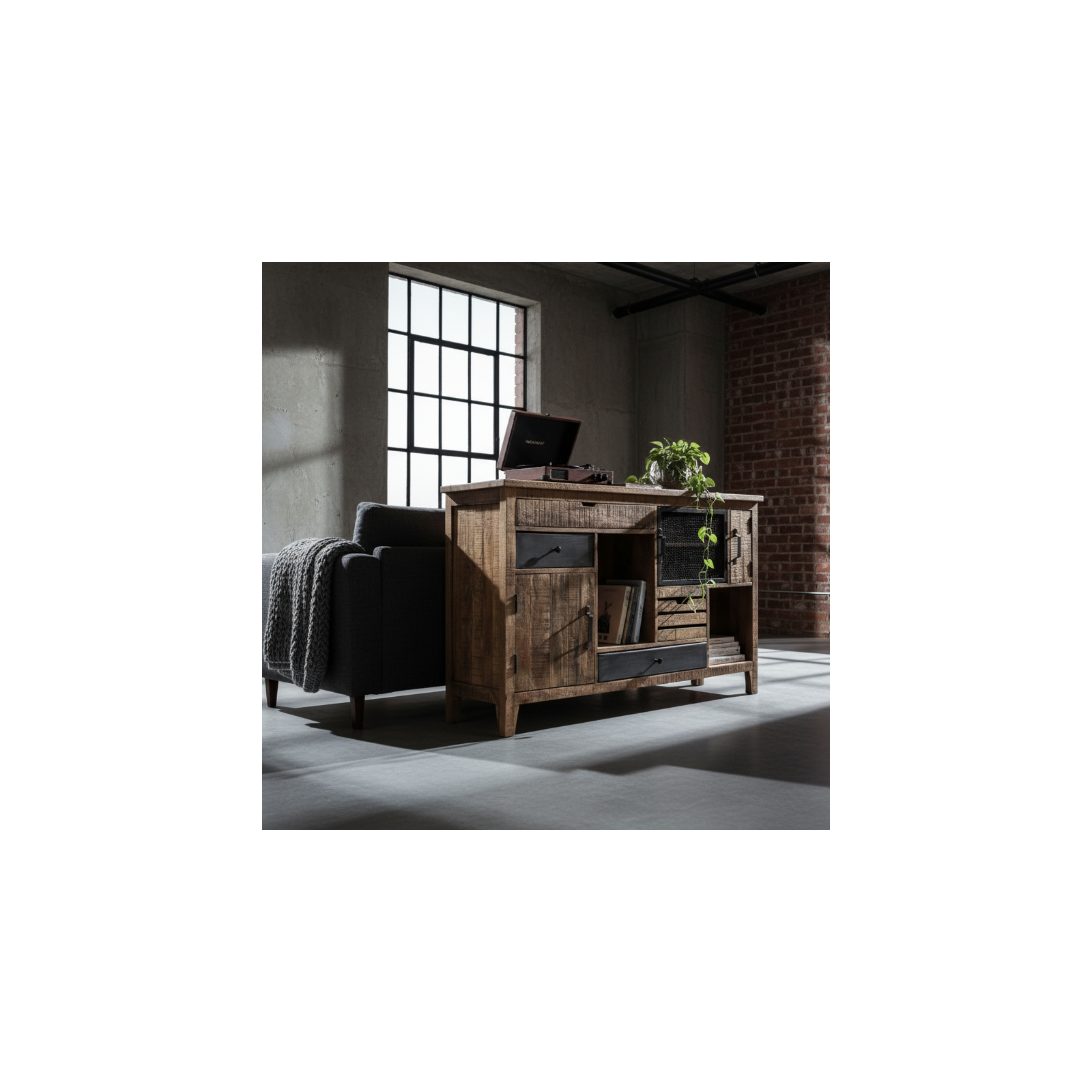 Le buffet 3 portes 4 tiroirs de la collection Manguier Brut incarne la fusion parfaite entre l'authenticité du bois et la fonctionnalité moderne.
