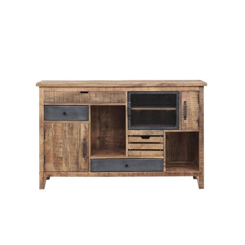 Conçu avec soin à partir de manguier massif, MDF et métal, ce meuble représente une pièce maîtresse élégante et pratique pour votre espace de vie. Arborant un coloris brun/miel chaleureux, le buffet met en valeur la richesse naturelle du bois de manguier massif. Soutenu par des panneaux MDF, il bénéficie d'une structure robuste, assurant une stabilité et une durabilité exceptionnelles. Le buffet offre une solution de rangement complète avec ses 3 portes, 4 tiroirs et 2 niches. Les portes et les tiroirs, équipés de façades en métal, ajoutent une touche contemporaine et industrielle au design global. Les niches offrent un espace supplémentaire pour exposer des objets décoratifs ou ranger des articles à portée de main.