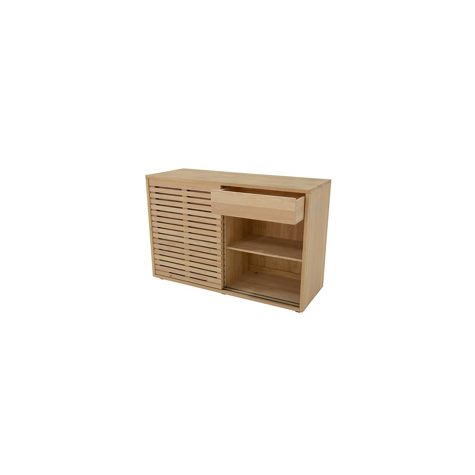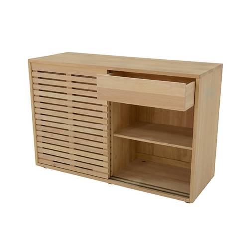 Ce petit buffet en bois massif ne fait que 120 cm de long. Pourtant, on peut y ranger bien des choses ! Il est doté de deux portes coulissantes ajourées qui cachent des étagères et même un tiroir pour y ranger vos couverts. Ce petit meuble, très pratique, ira dans un séjour où la place commence à manquer. Sa silhouette minimaliste est très tendance !
