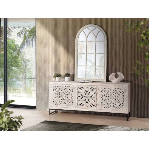 Buffet 4 portes et 3 tiroirs en bois de manguier et base en métal, avec des détails faits à la main.
