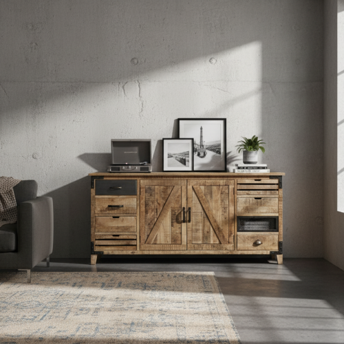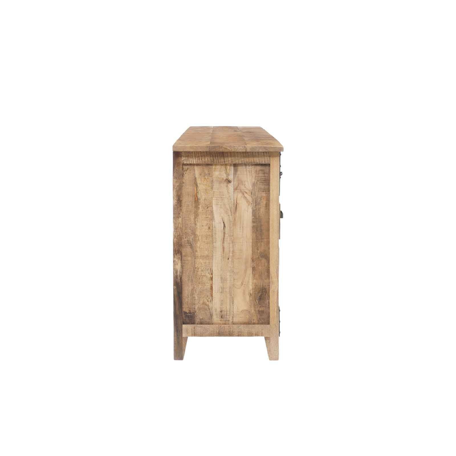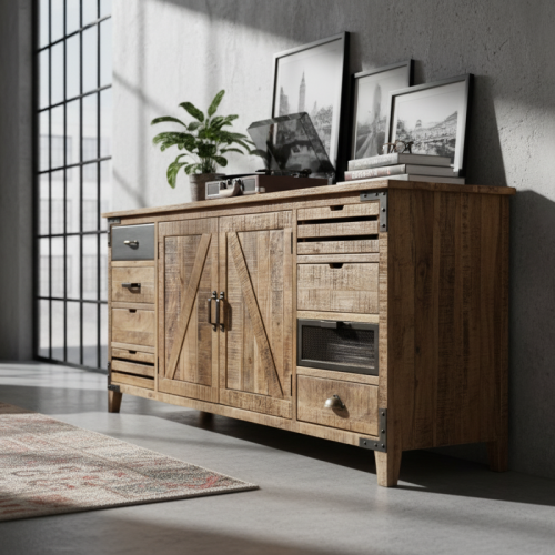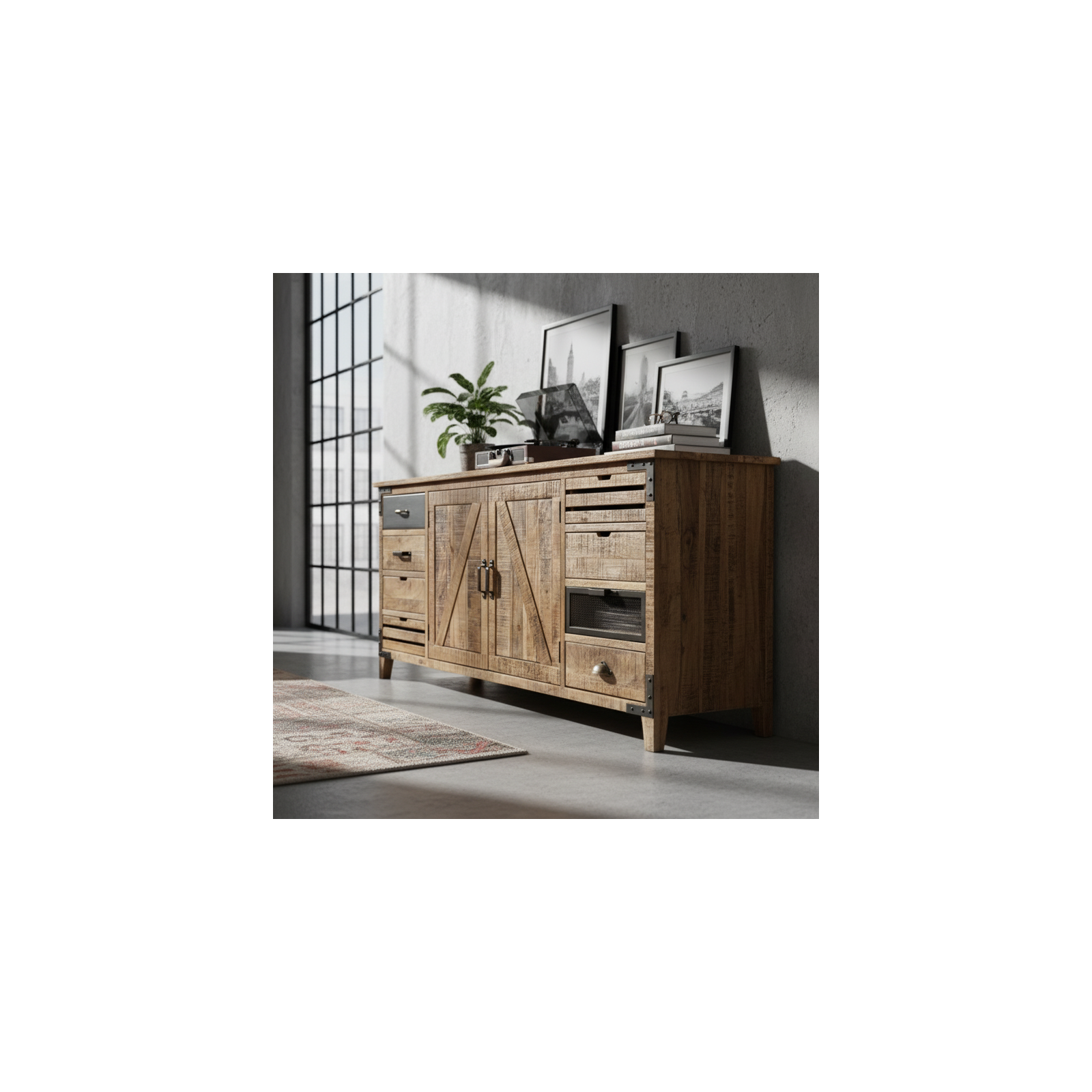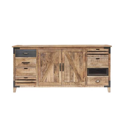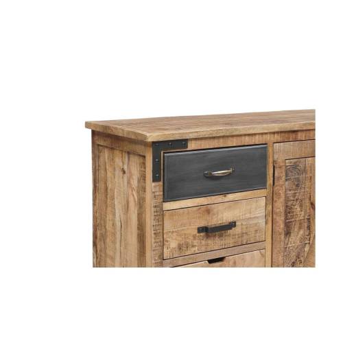 Le buffet bois brut incarne l'esthétique authentique à partir de manguier massif, MDF et métal. Il allie charme naturel du bois et éléments modernes.