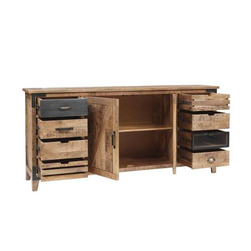Sa teinte brun/miel soutenue met en valeur la beauté naturelle du bois de manguier massif. Soutenu par des panneaux MDF, le buffet bénéficie d'une structure robuste, assurant une stabilité et une durabilité exceptionnelles. Doté de 2 portes et 8 tiroirs, ce meuble offre un espace de rangement généreux et bien organisé. Les portes et les tiroirs, agrémentés de façades en métal, ajoutent une touche contemporaine et industrielle, créant un contraste visuel captivant.