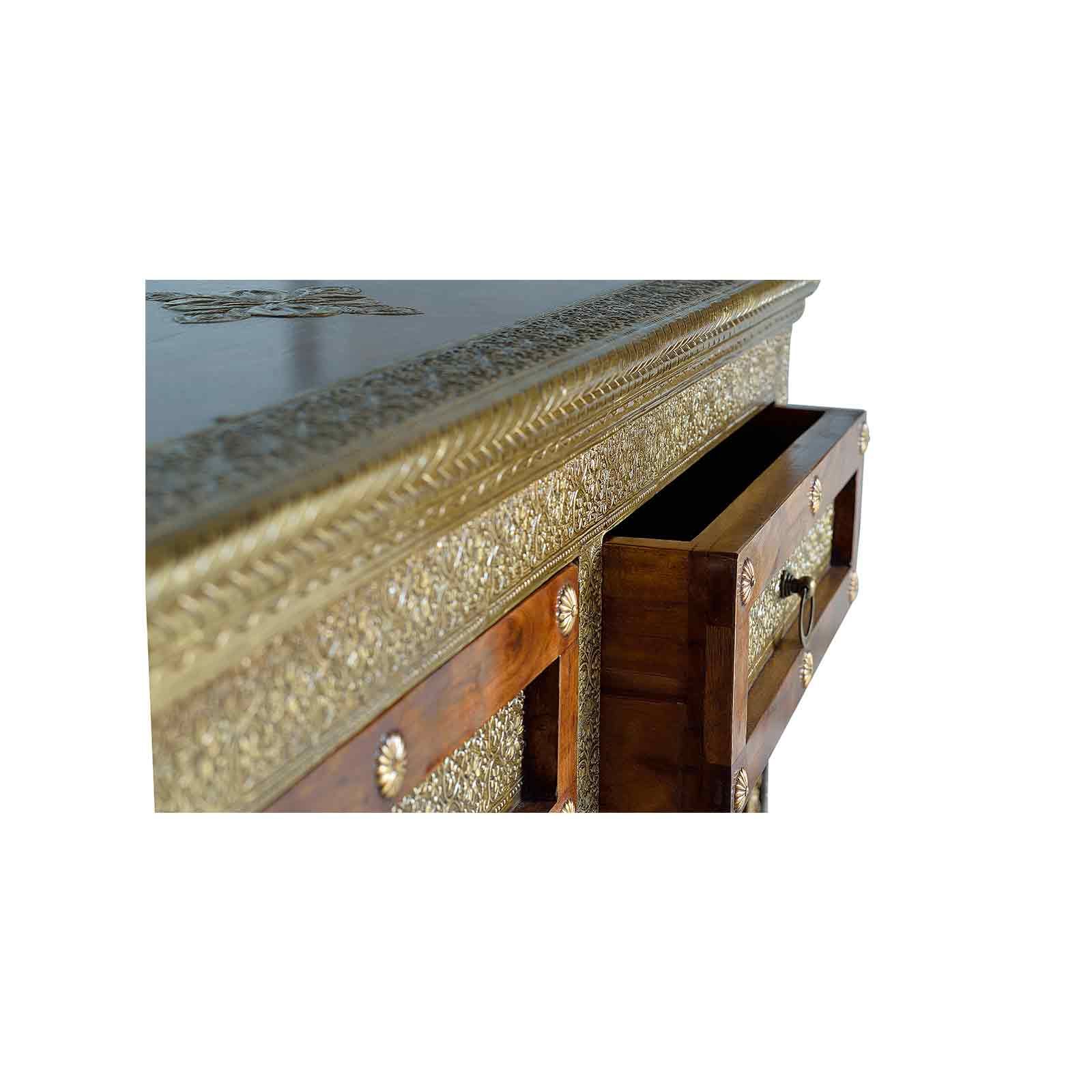 Le buffet bois et doré est un meuble somptueux qui marie harmonieusement l'élégance du bois d'acacia à la brillance raffinée du bronze. Une touche de luxe.