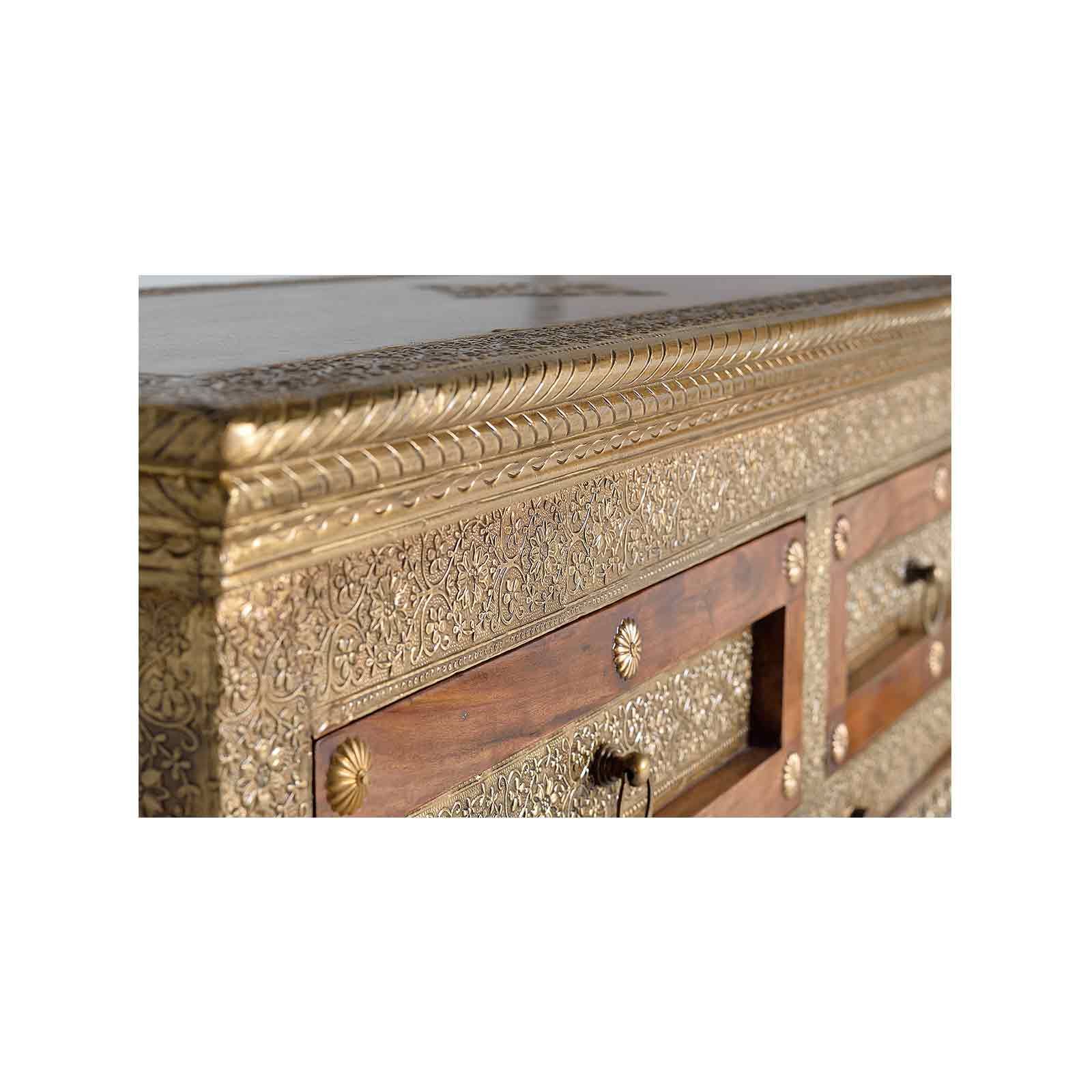Fabriqué en acacia, un bois exotique réputé pour sa solidité et sa beauté naturelle, ce buffet offre une qualité exceptionnelle et une durabilité remarquable. La teinte chaleureuse de l'acacia crée une ambiance accueillante et apaisante dans votre espace de vie. Ce qui rend ce buffet véritablement unique, ce sont les détails en mosaïques et en bronze qui ornent sa surface. Les mosaïques, réalisées avec un savoir-faire artisanal, ajoutent une touche artistique et colorée, créant ainsi une esthétique bohème et exotique. Les détails en bronze soulignent avec élégance les contours du buffet, apportant une touche de sophistication et de luxe.