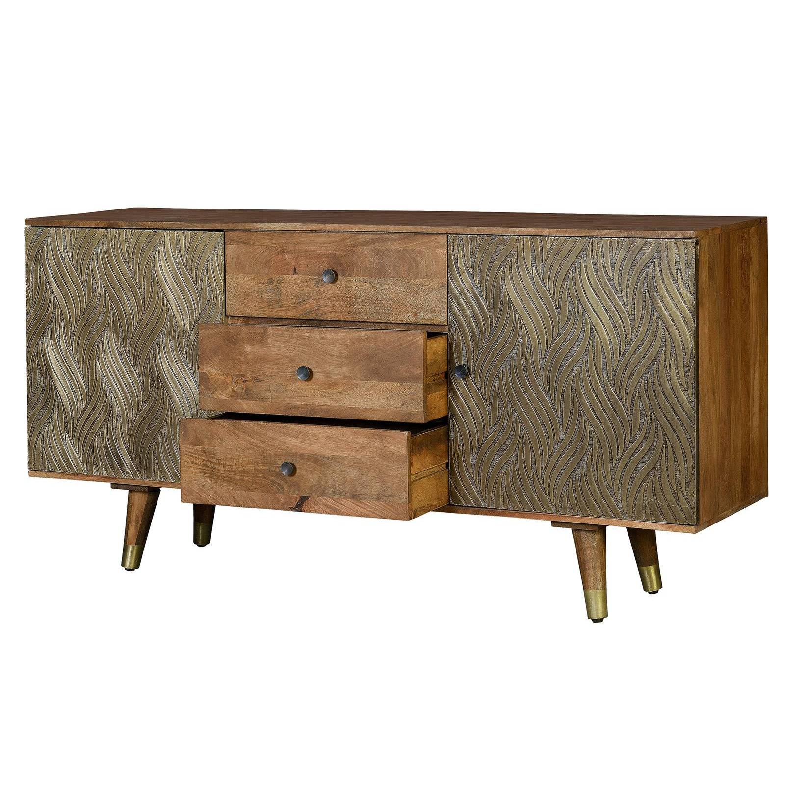 Craquez pour ce beau buffet bois metal en manguier massif exotique. Les deux portes de ce meuble déco sont recouvertes de bronze finement sculpté.