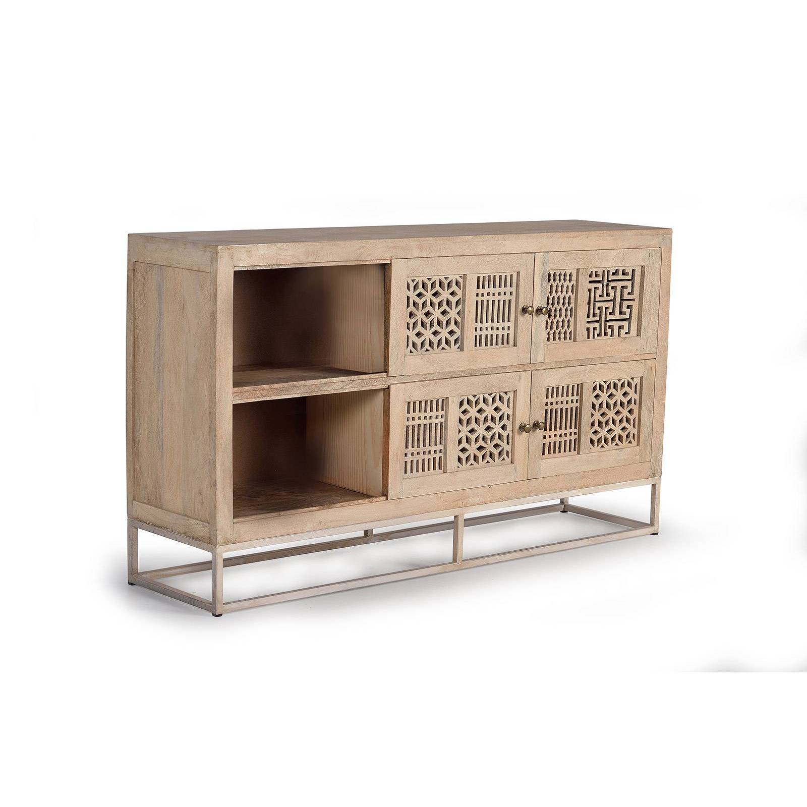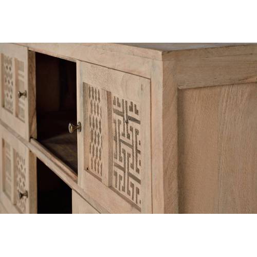Découvrez ce beau buffet bois porte coulissante en manguier massif sculpté à la main. Un meuble déco au style unique pour la cuisine ou le séjour.
