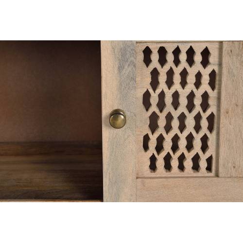 Plongez dans l'élégance intemporelle avec ce buffet bois à porte coulissante de la collection Manguier Kasbah. Fabriqué avec un art méticuleux à partir de manguier massif, chaque centimètre de ce meuble est une manifestation de la virtuosité artisanale. Ajoutant une dimension artistique à votre espace, ce buffet incarne la fusion parfaite entre fonctionnalité et esthétique. Chaque détail sculpté à la main révèle le caractère organique et les variations uniques du bois de manguier, créant ainsi une œuvre d'art fonctionnelle qui s'intègre harmonieusement dans votre cuisine ou votre séjour. La porte coulissante, ornée de motifs entrelacés et de motifs géométriques élaborés, cache des compartiments spacieux pour accueillir vaisselle, linge de table, ustensiles et autres trésors domestiques.