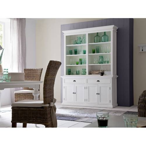 Sobre et pratique, ce grand buffet vaisselier en acajou peint en blanc de la collection Torini a tout pour plaire. Il s'agit d'un meuble écologique parfait pour une déco bord de mer.