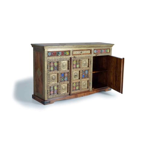 Ce qui rend ce buffet vraiment exceptionnel, ce sont les détails en mosaïques et en bronze qui ornent ses portes et ses tiroirs. Les mosaïques, réalisées avec minutie, apportent une touche artistique et colorée, ajoutant une esthétique bohème et exotique. Les détails en bronze, quant à eux, ajoutent une touche de raffinement et d'élégance au design global du buffet. Avec ses 3 tiroirs et ses 3 portes, ce buffet offre un espace de rangement spacieux et organisé pour vos objets du quotidien. Les tiroirs vous permettent de garder vos petits objets à portée de main, tandis que les portes cachent discrètement le contenu que vous souhaitez garder hors de vue.