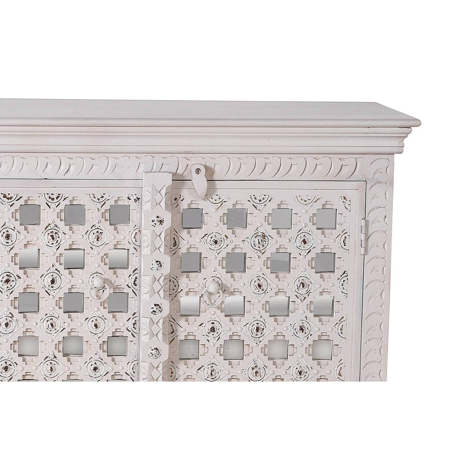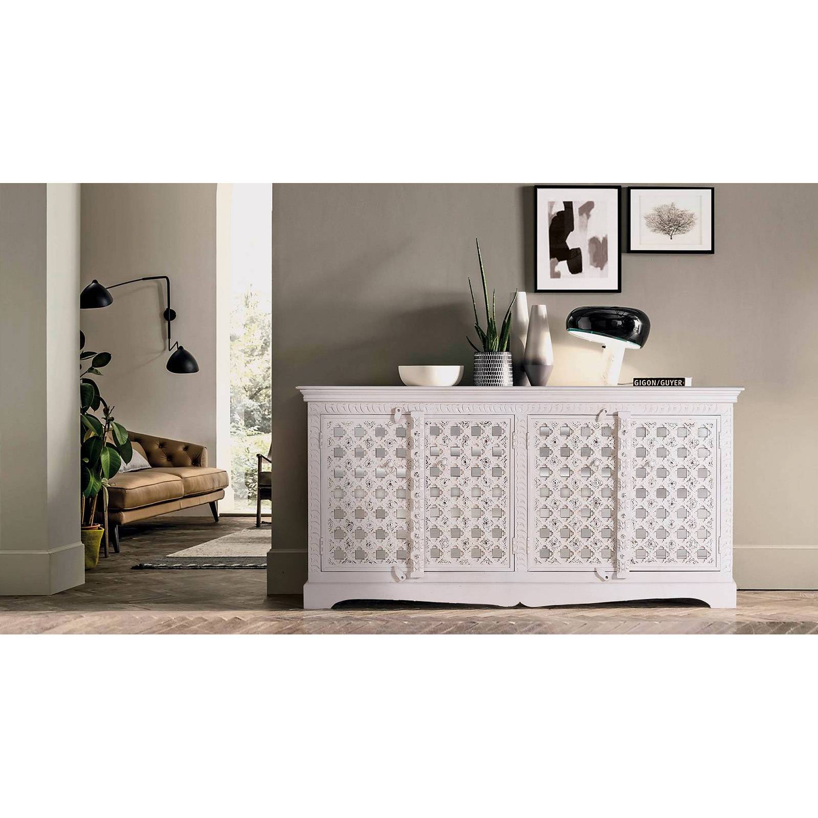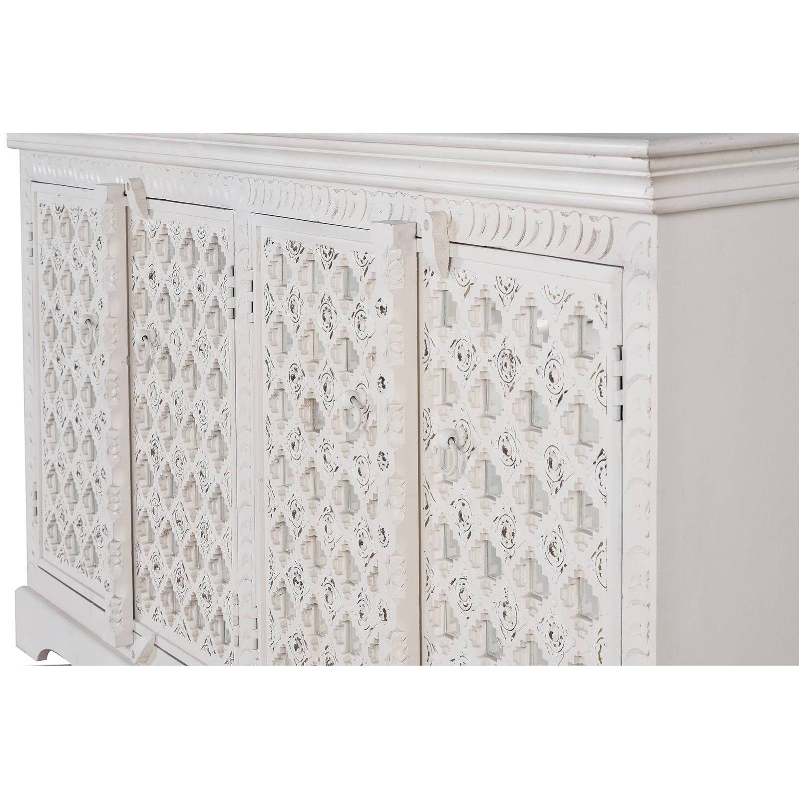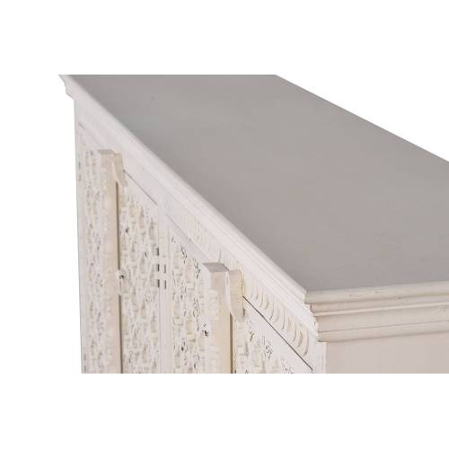 Ce buffet en manguier 4 portes vitrées a été délicatement sculpté à la main de motifs exotiques uniques. C'est un meuble déco ethnique et original.