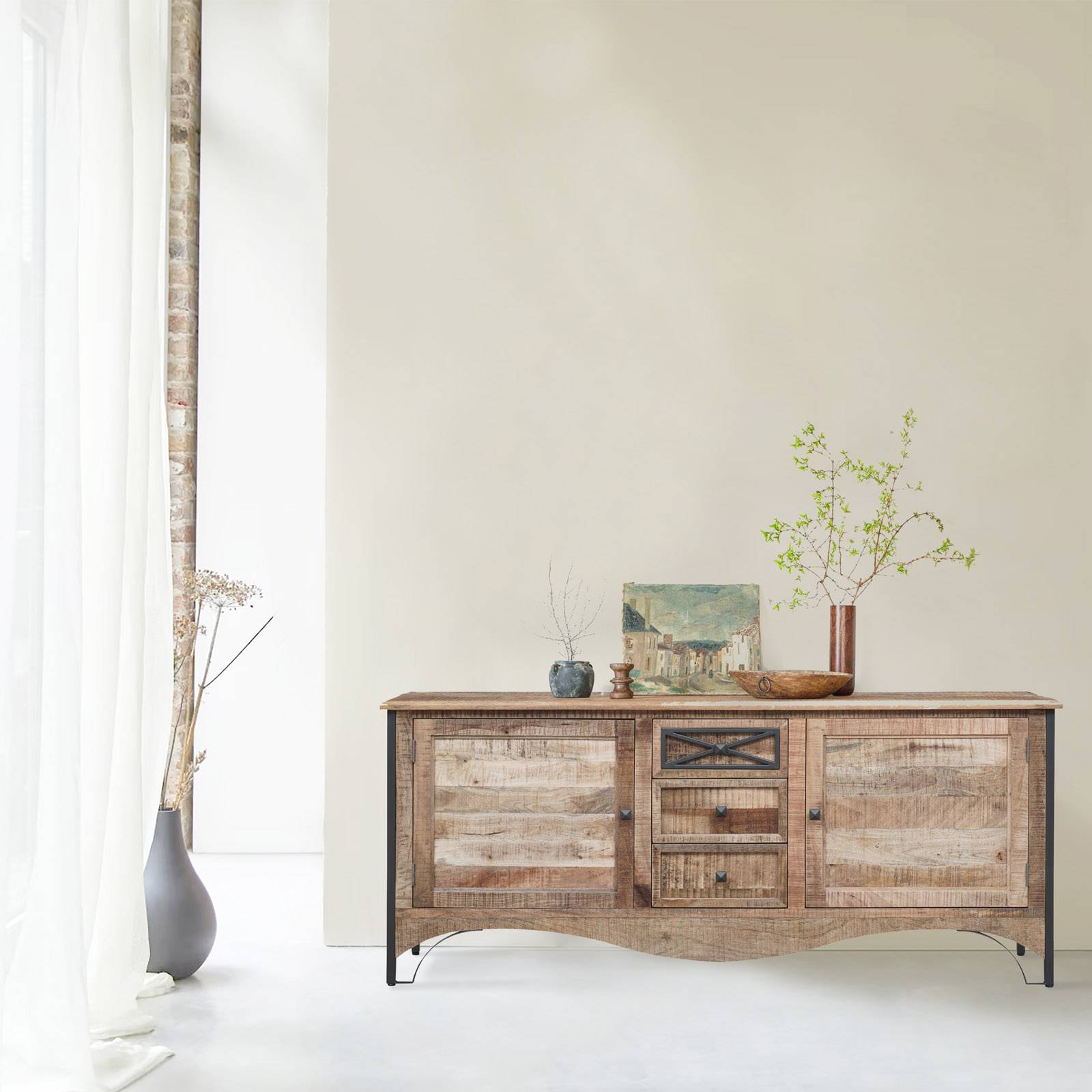 Le buffet exotique 2 portes 3 tiroirs en manguier massif et métal est l'essence même du raffinement et de l'exotisme mettant en valeur les nuances du bois.
