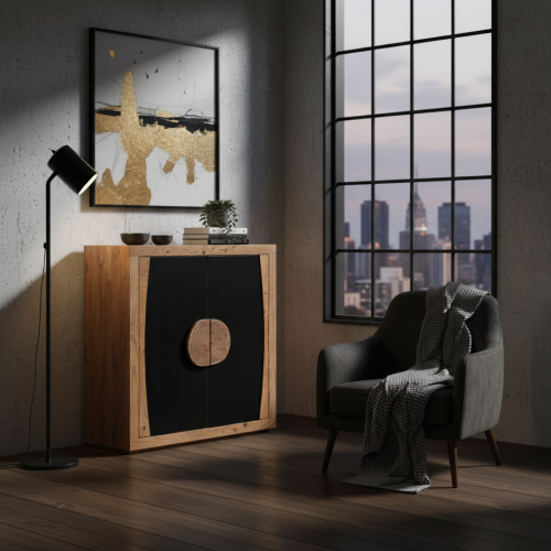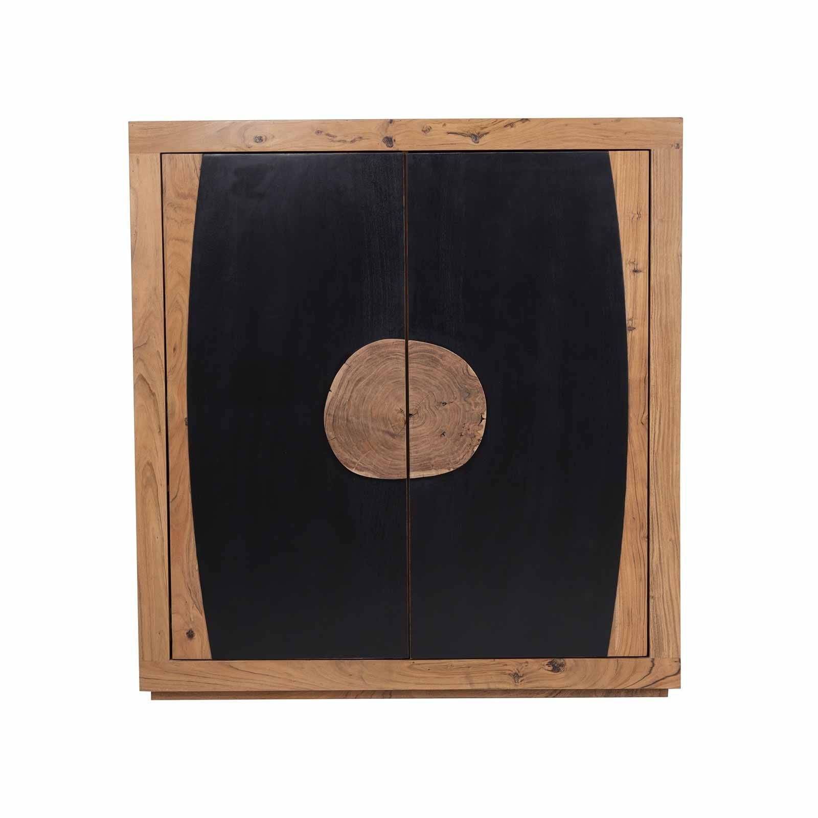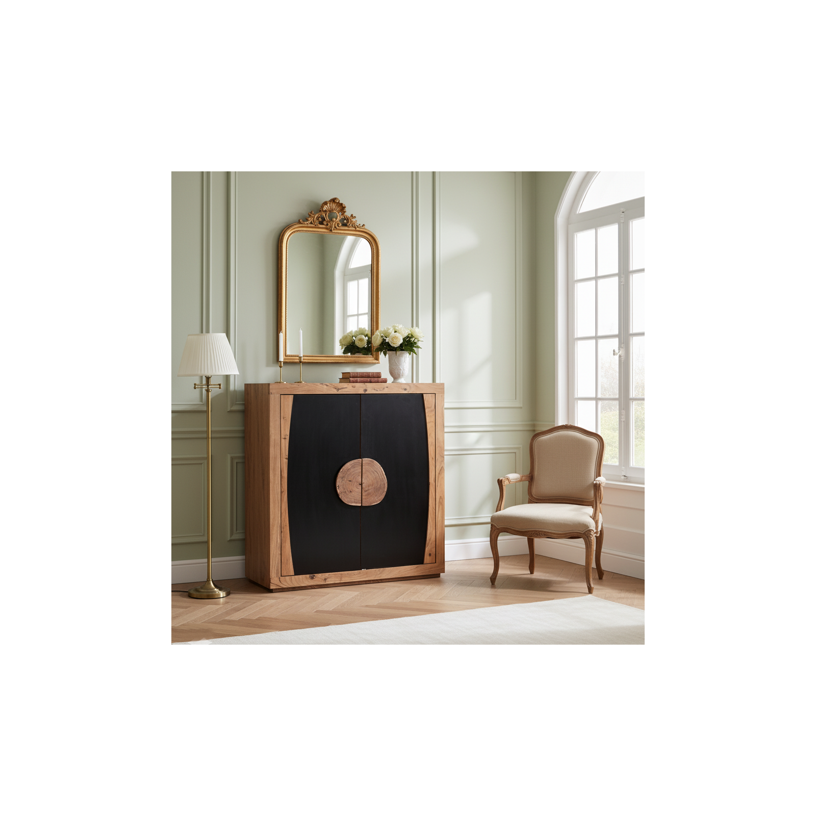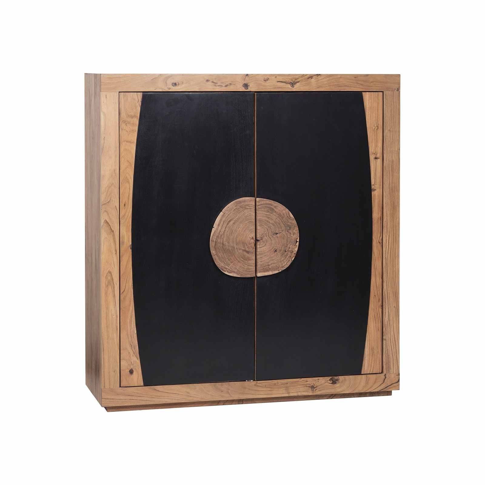 Découvrez l'élégance du buffet haut 2 portes fabriqué à partir d'acacia, sublimée par une teinte naturelle vernie et un coloris noir qui le rend moderne.