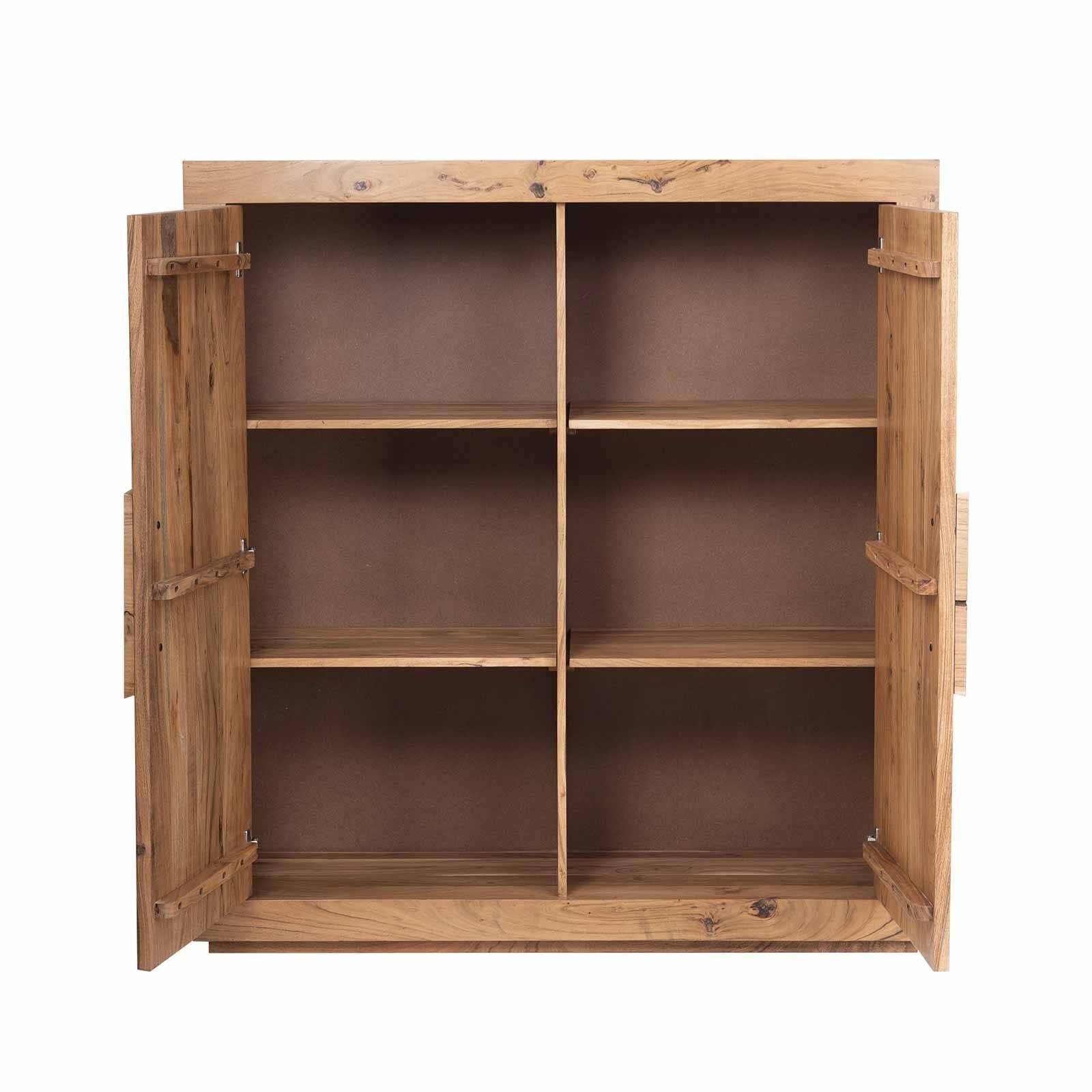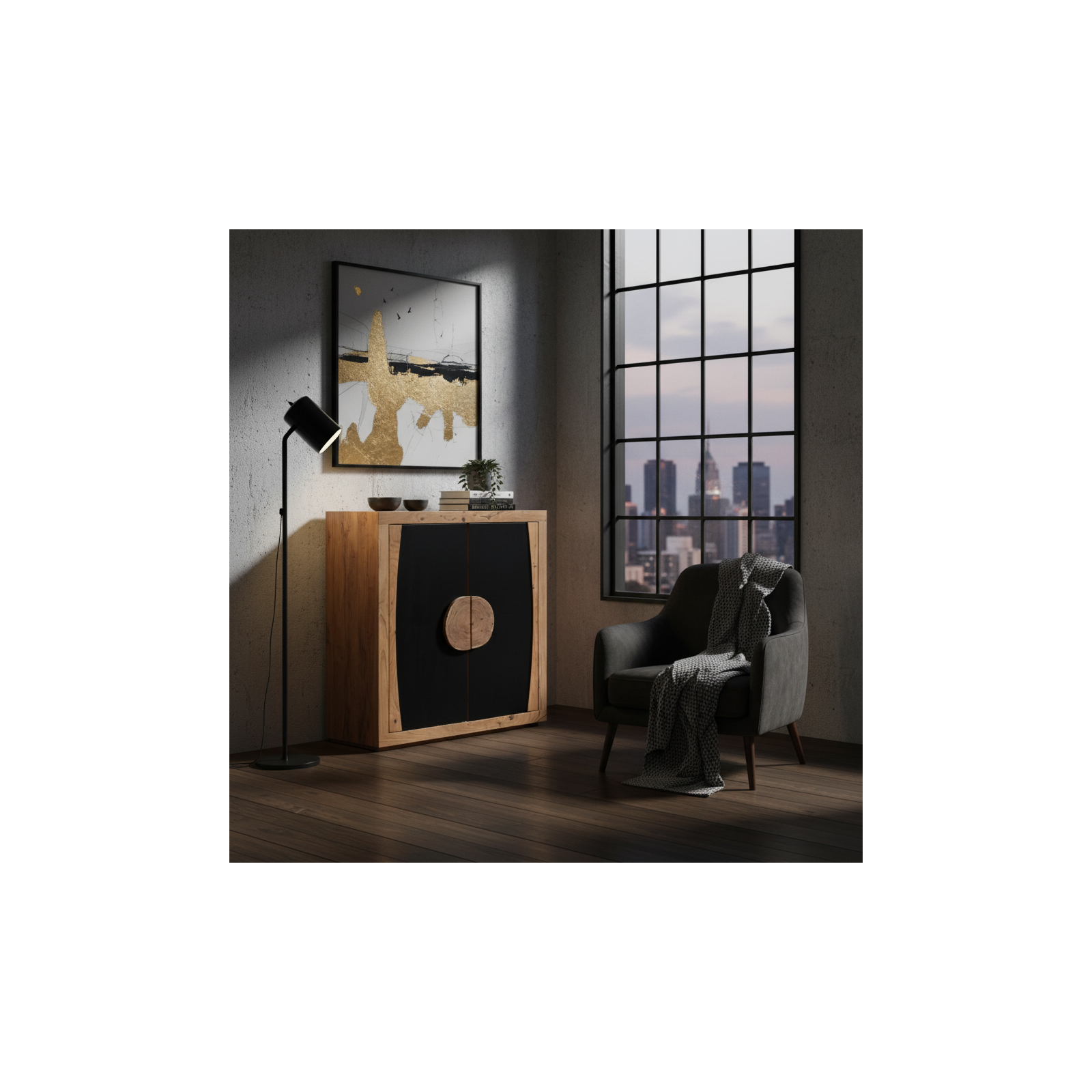La beauté authentique du bois d'acacia est mise en valeur par une finition naturelle vernie qui révèle ses riches nuances et ses motifs naturels, créant ainsi une atmosphère chaleureuse et accueillante dans votre espace de vie. Le contraste subtil avec le coloris noir des portes apporte une touche de modernité et d'élégance, faisant de ce buffet un élément central de votre décoration intérieure. Les deux portes du buffet offrent un espace de rangement généreux pour vos articles de cuisine, vaisselle, linge de table et bien plus encore, vous permettant ainsi de garder votre espace organisé et dégagé.