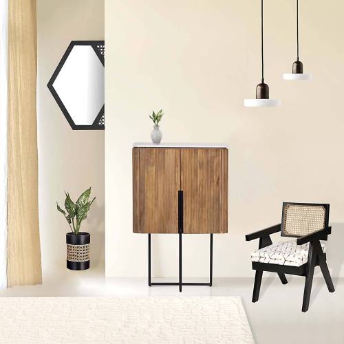 Ce buffet haut combine une esthétique moderne et des matériaux de haute qualité pour offrir une pièce maîtresse élégante dans votre salon. Le plateau en marbre blanc apporte une touche de sophistication, créant une surface lisse et brillante qui contraste magnifiquement avec la chaleur du bois massif. Le cadre en métal noir, robuste et élégant, assure la durabilité et la stabilité de ce meuble exceptionnel.