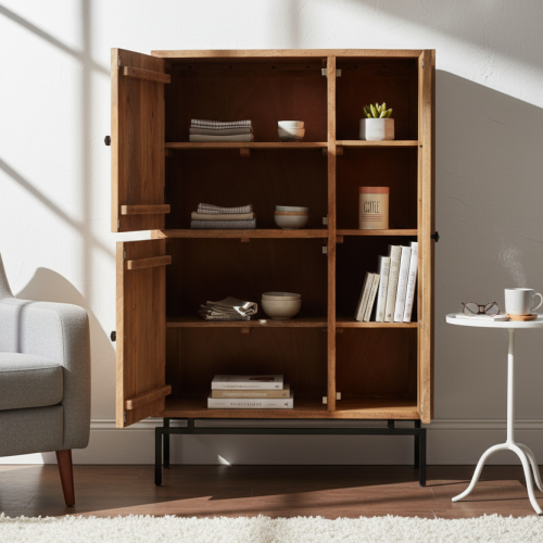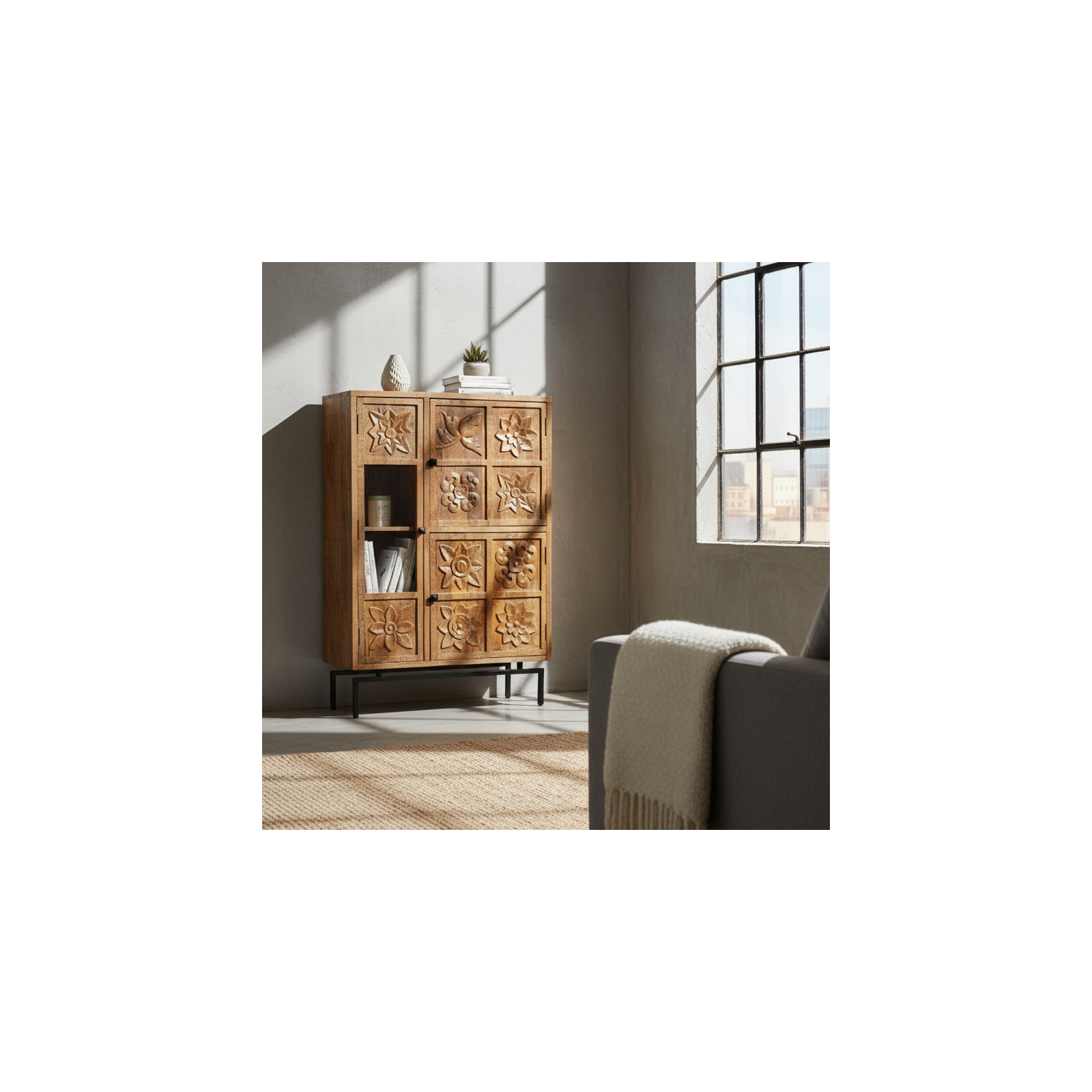 Sa structure solide en bois massif de manguier, d'une épaisseur de 2,5 cm, offre une robustesse inégalée tout en diffusant une aura de chaleur naturelle dans votre maison. La couleur naturelle met en valeur la beauté authentique du bois, créant une atmosphère accueillante et raffinée dans votre intérieur. Doté de trois portes, dont une vitrée pour exposer vos objets préférés, ce buffet offre un espace de rangement généreux pour votre vaisselle ou votre linge de maison. À l'intérieur, quatre étagères offrent une organisation pratique pour vos ustensiles de cuisine, vos livres ou vos objets de décoration. Les portes sculptées à la main, ornées de motifs floraux délicats, ajoutent une touche artistique et poétique à la pièce, invitant à l'évasion et au voyage.