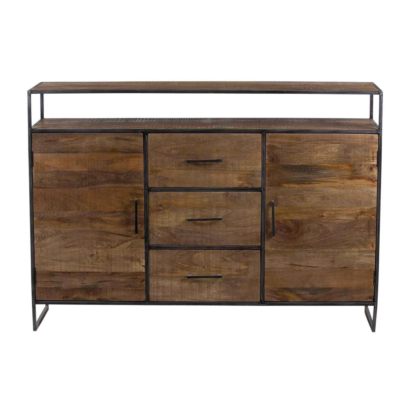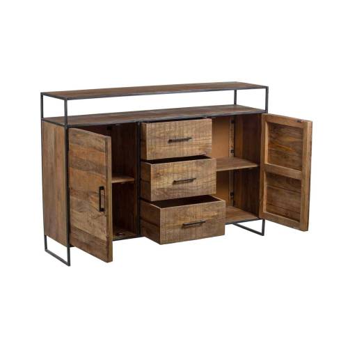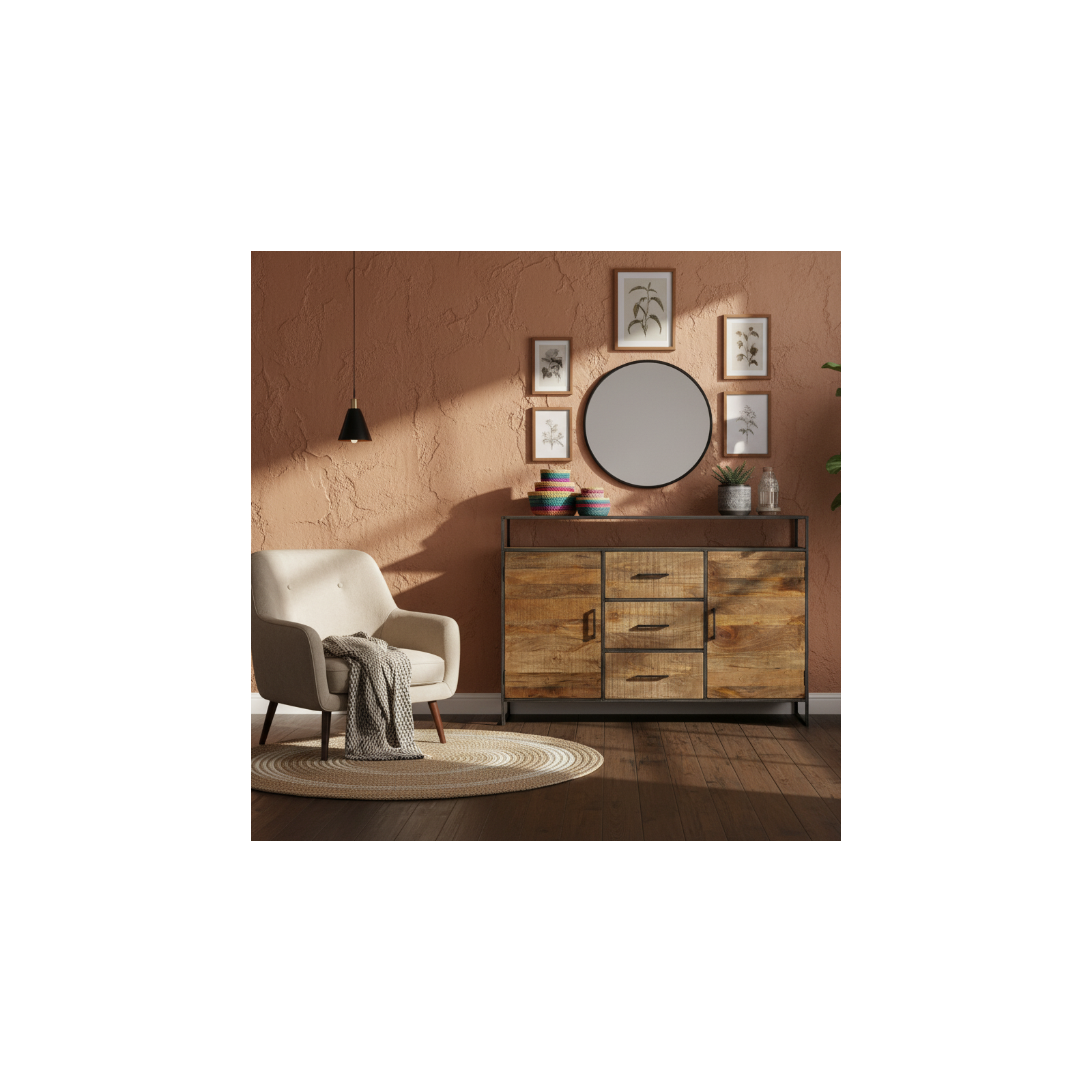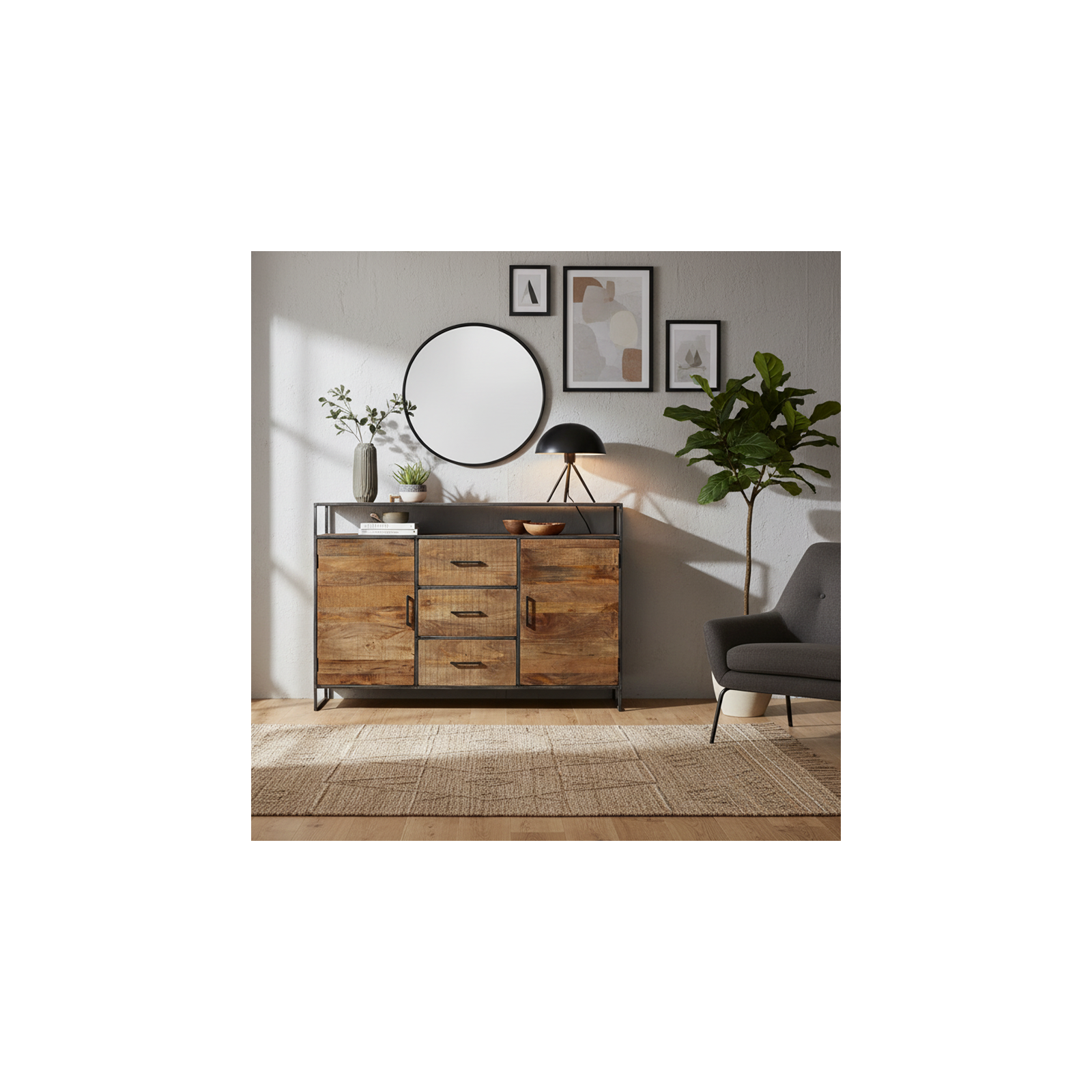 Le buffet manguier et métal marrie parfaitement la fonctionnalité contemporaine et le style industriel audacieux avec ses 2 portes et 3 tiroirs.