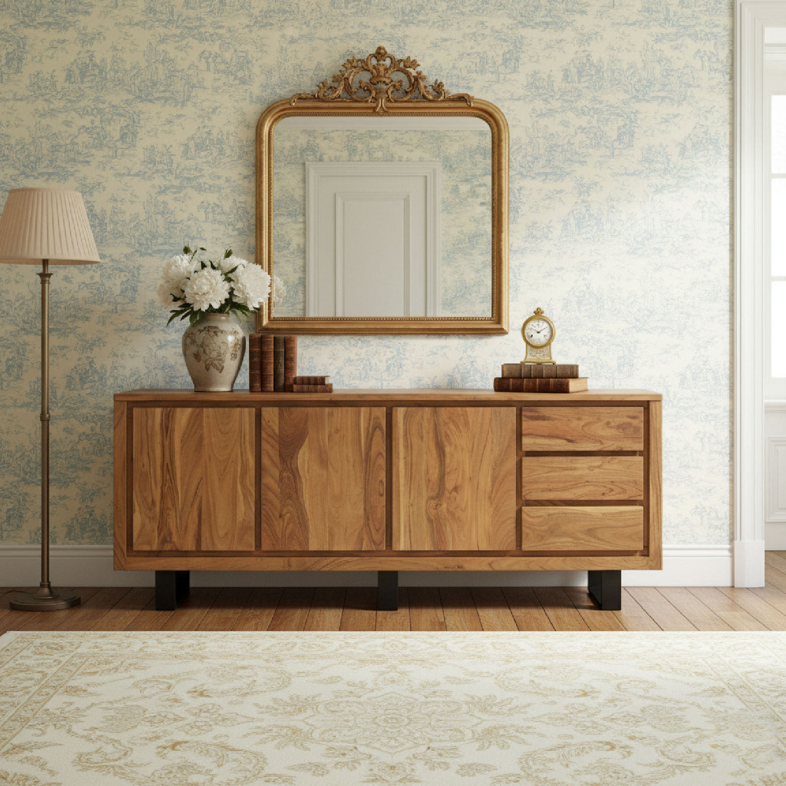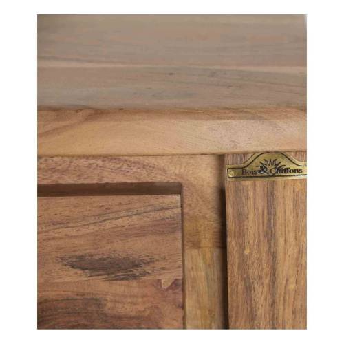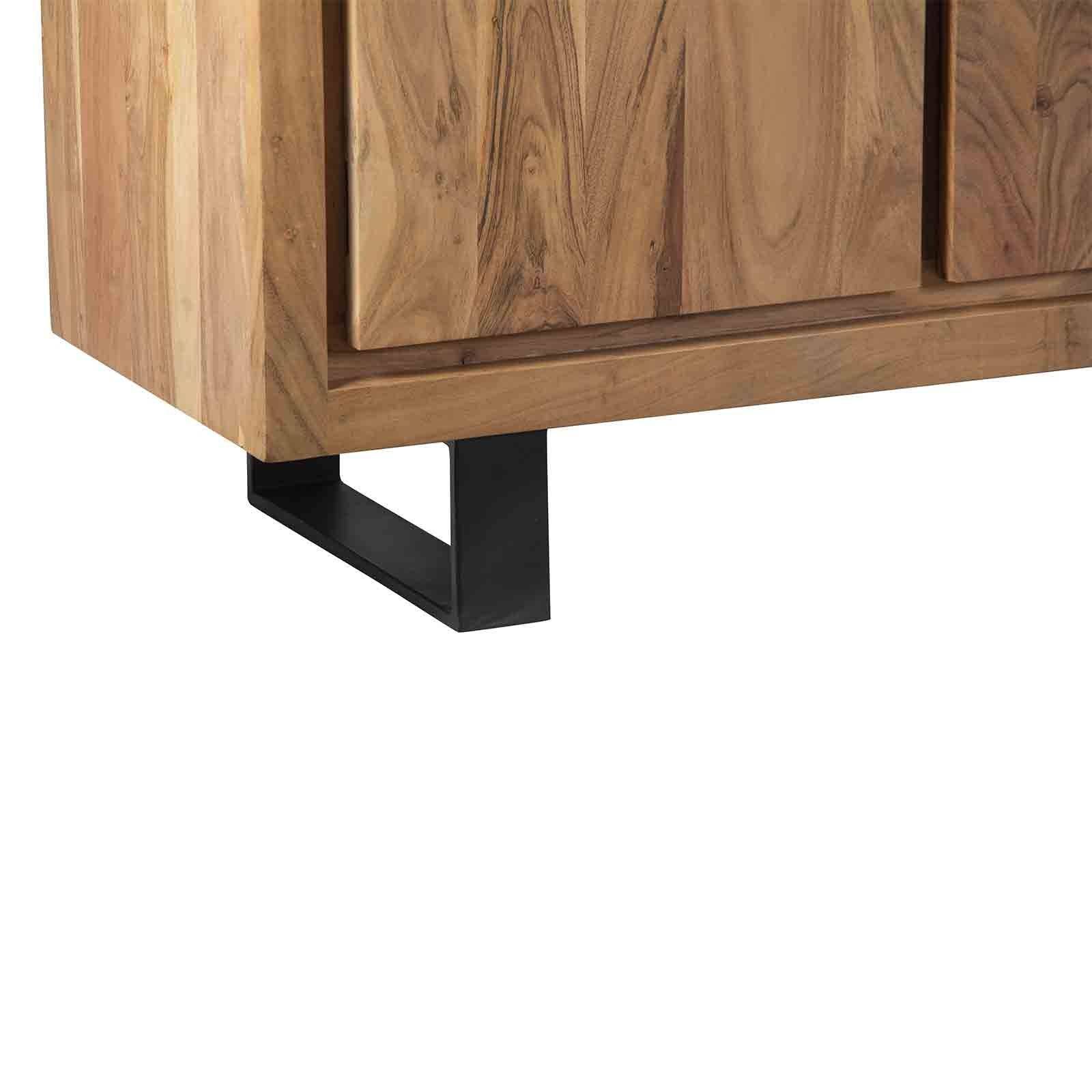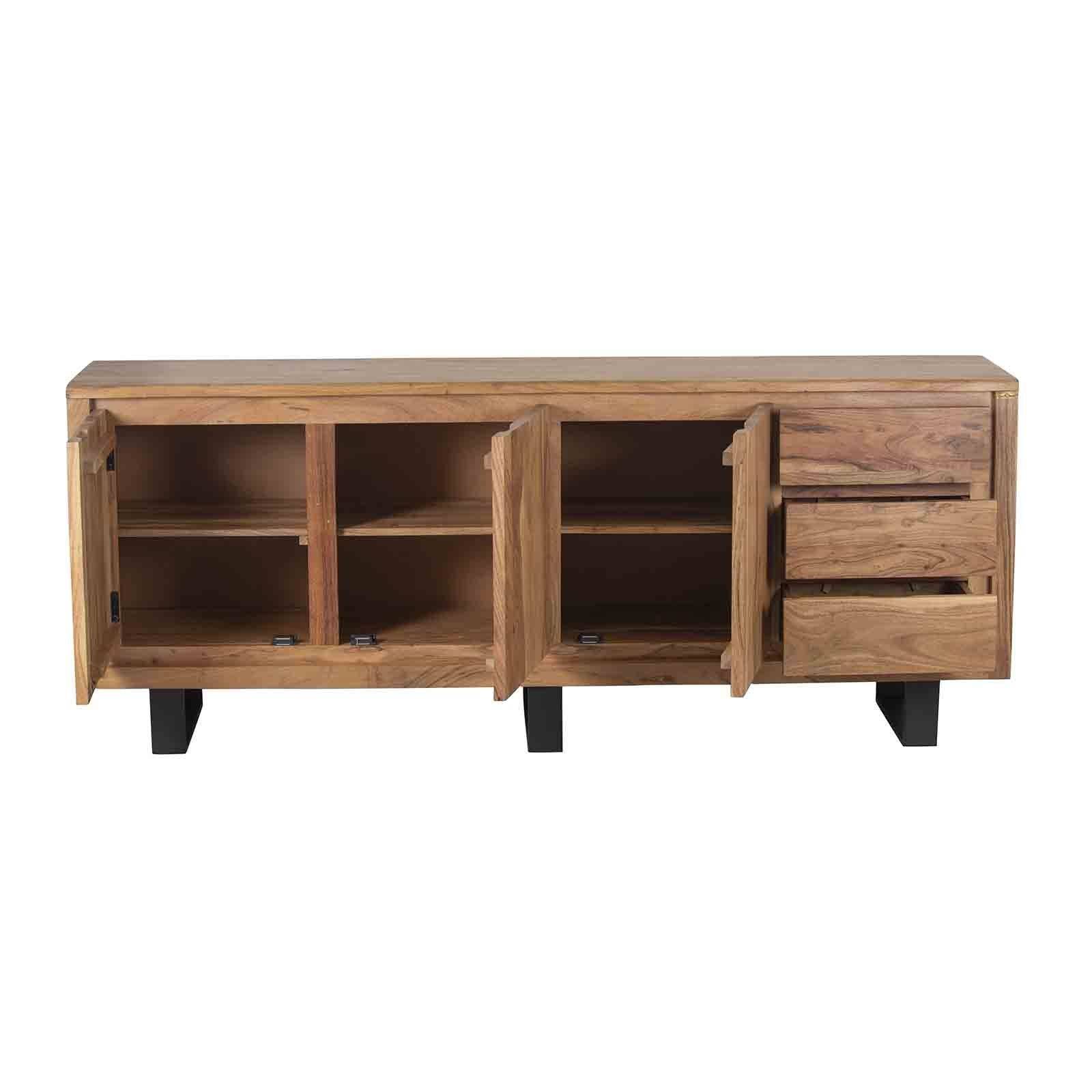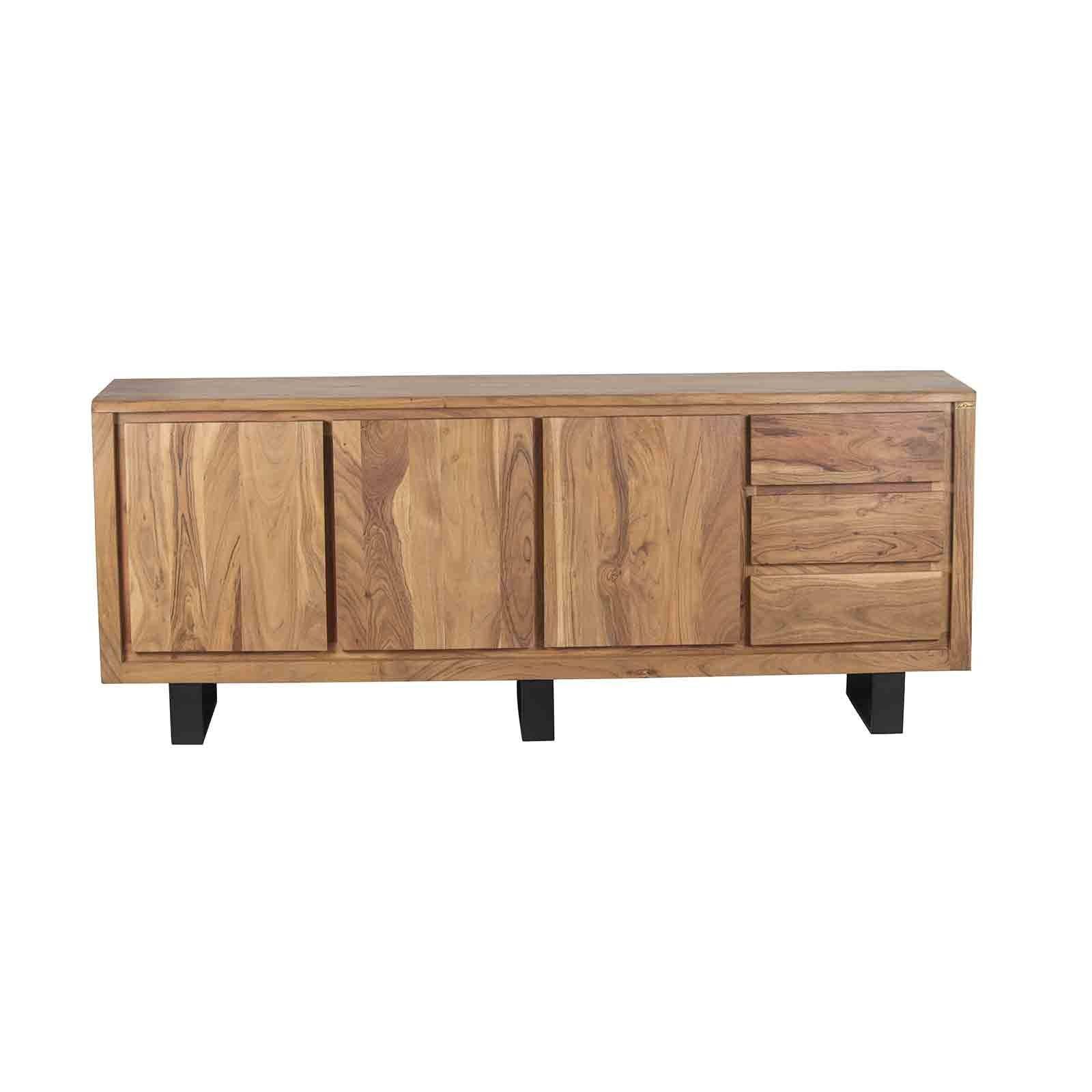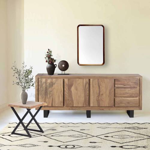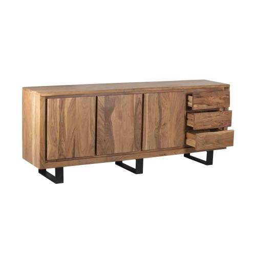 Doté de trois portes et de trois tiroirs, ce buffet offre un vaste espace de rangement pour organiser soigneusement votre vaisselle, vos couverts, ou même votre linge de maison. Les portes, aux lignes épurées, dissimulent un intérieur spacieux, tandis que les tiroirs offrent une solution pratique pour un rangement organisé. La combinaison du bois d'acacia et de l'acier industriel crée un contraste visuel captivant, conférant à ce buffet un caractère distinctif.