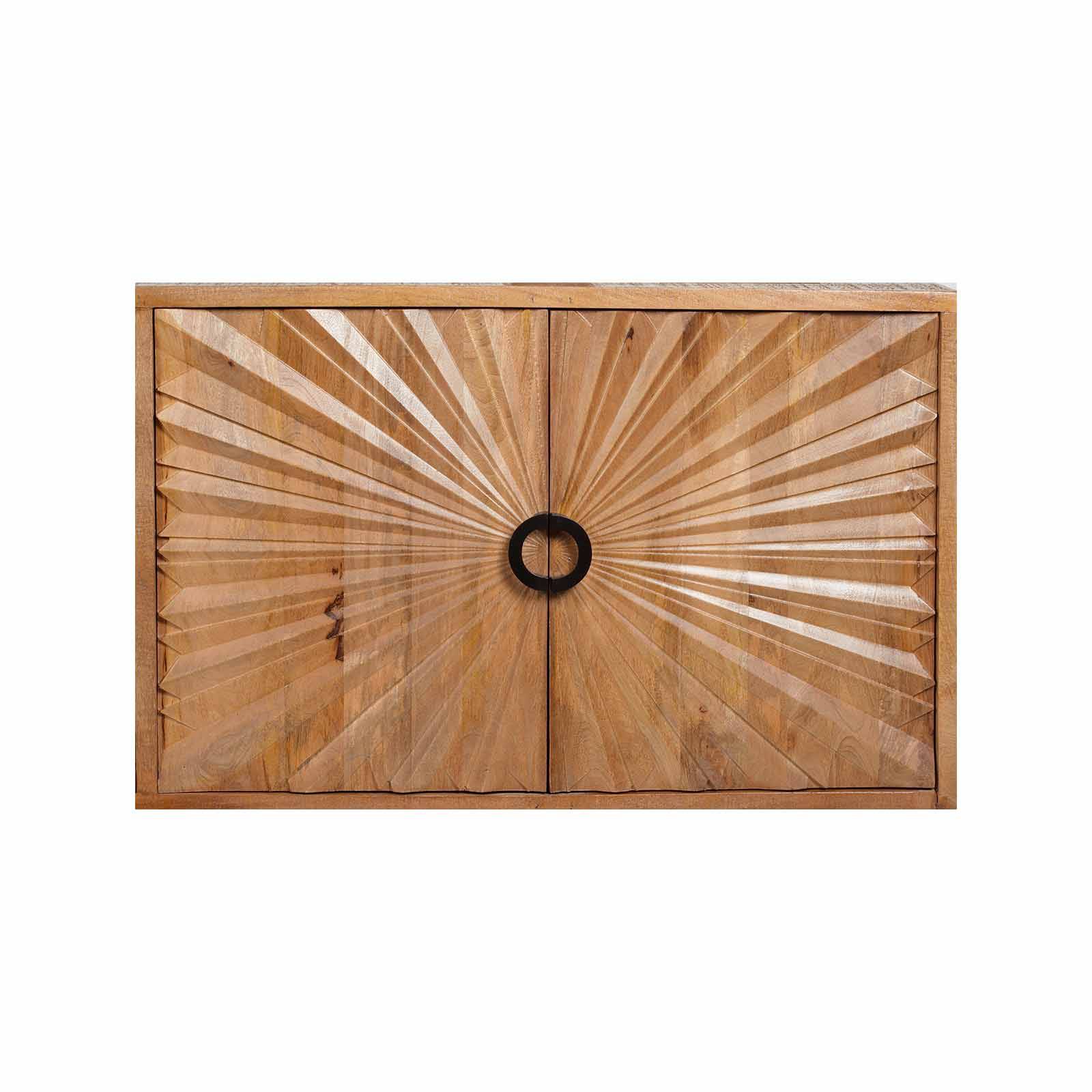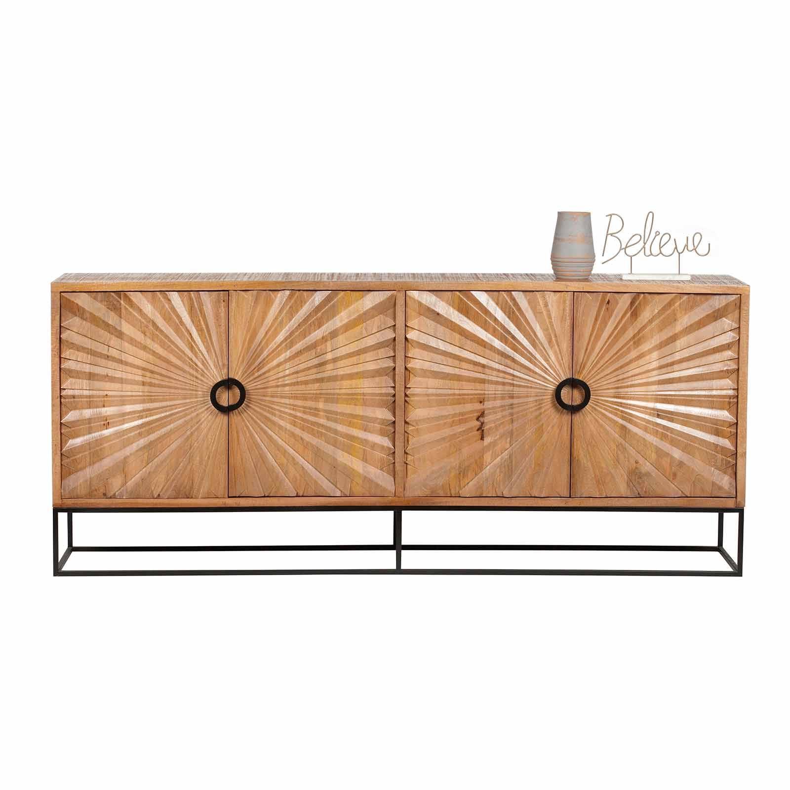 L'élément le plus saisissant de ce buffet réside dans sa façade sculptée, formée en rayons qui évoquent la chaleur et la lumière du soleil. Cette caractéristique distinctive, qui donne son nom à la collection, ajoute une touche artistique et une ambiance chaleureuse à votre espace de vie, créant ainsi un point focal captivant. Polyvalent et élégant, le buffet sculpté 4 portes de la collection Manguier Solis est un choix parfait pour compléter votre salle à manger ou votre cuisine, ajoutant à la fois style et fonctionnalité à votre pièce.