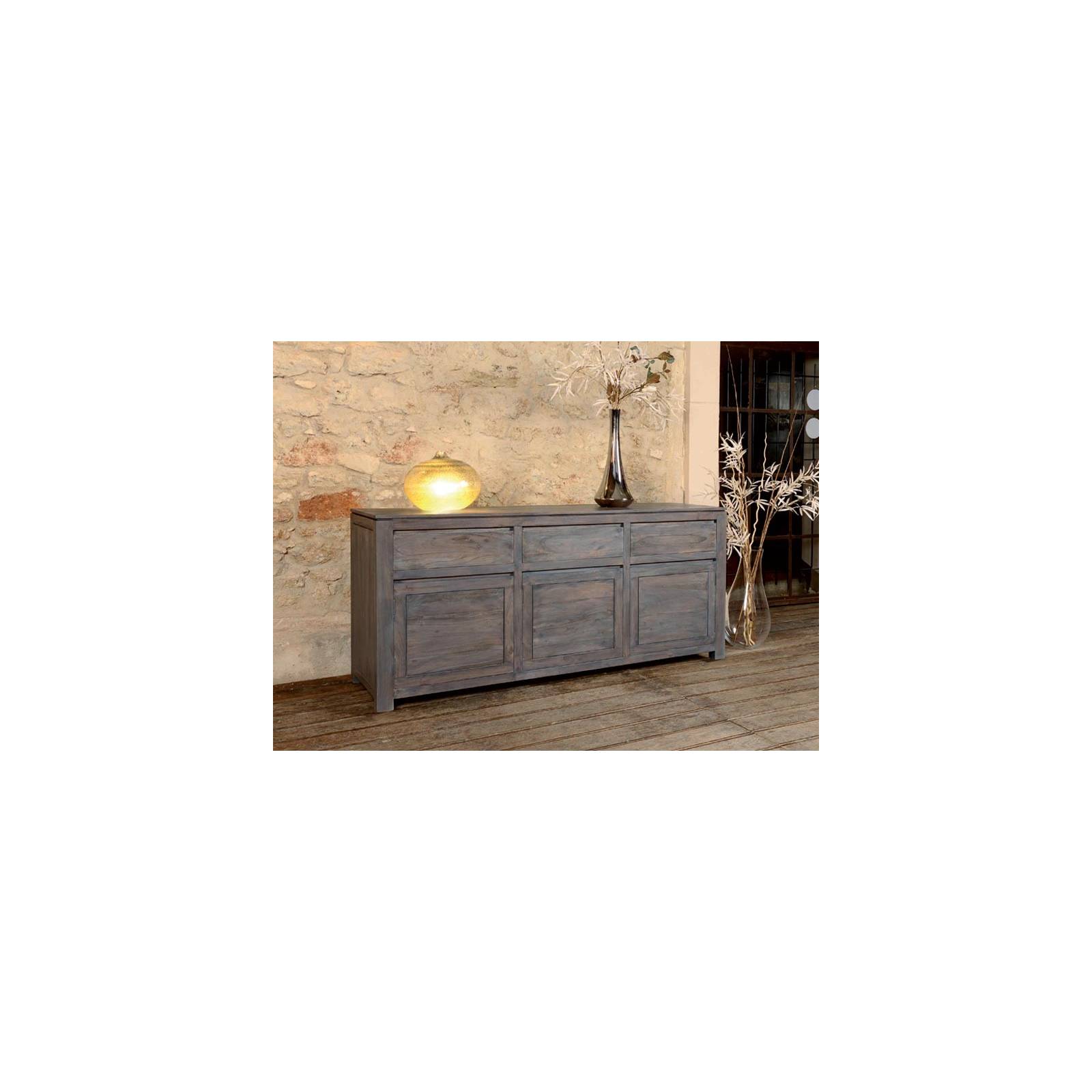 Superbe buffet design dont le bois exotique, de l'acacia, présente une belle teinte grisée, pour une décoration sobre et contemporaine. Fonctionnel, cet élégant meuble dispose de trois portes ainsi que de trois tiroirs, vous permettant de ranger votre vaisselle ainsi que votre linge de table (serviettes, chemin de table...). Le travail de son bois, de l'acacia massif, fut exécuté avec la plus grande attention, pour un résultat parfait aux lignes contemporaines, qui apporteront un esprit recherché à votre intérieur.
