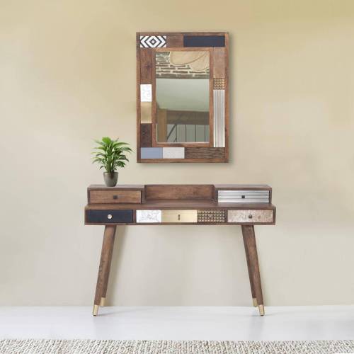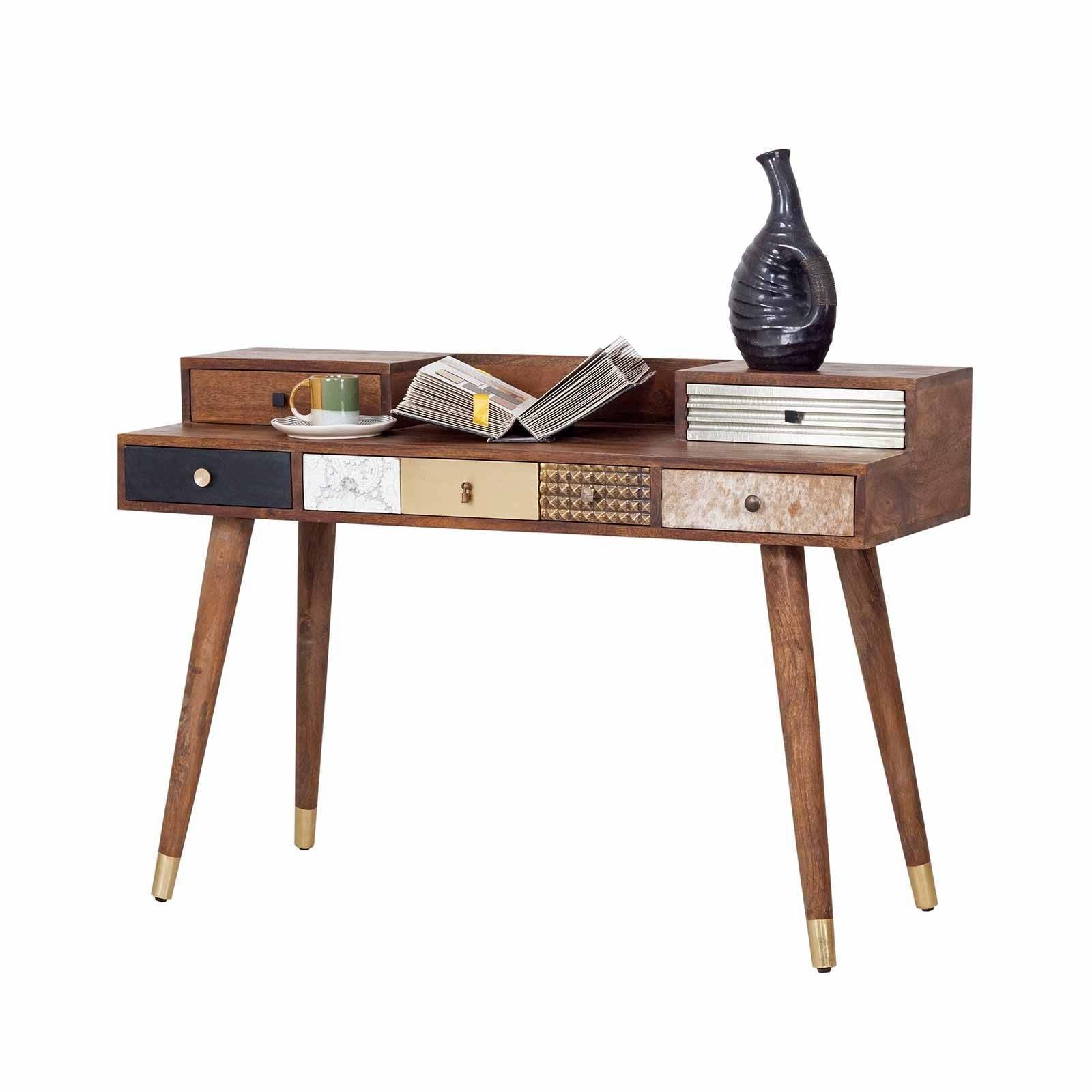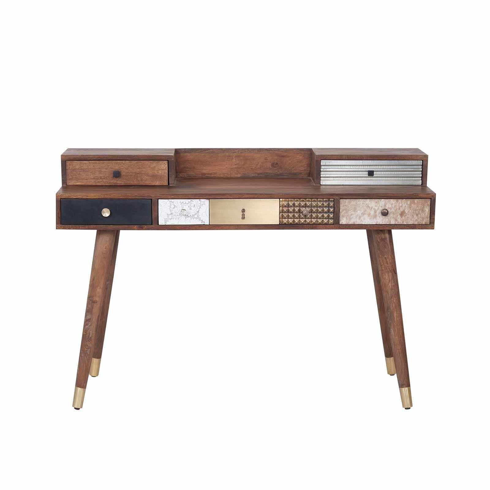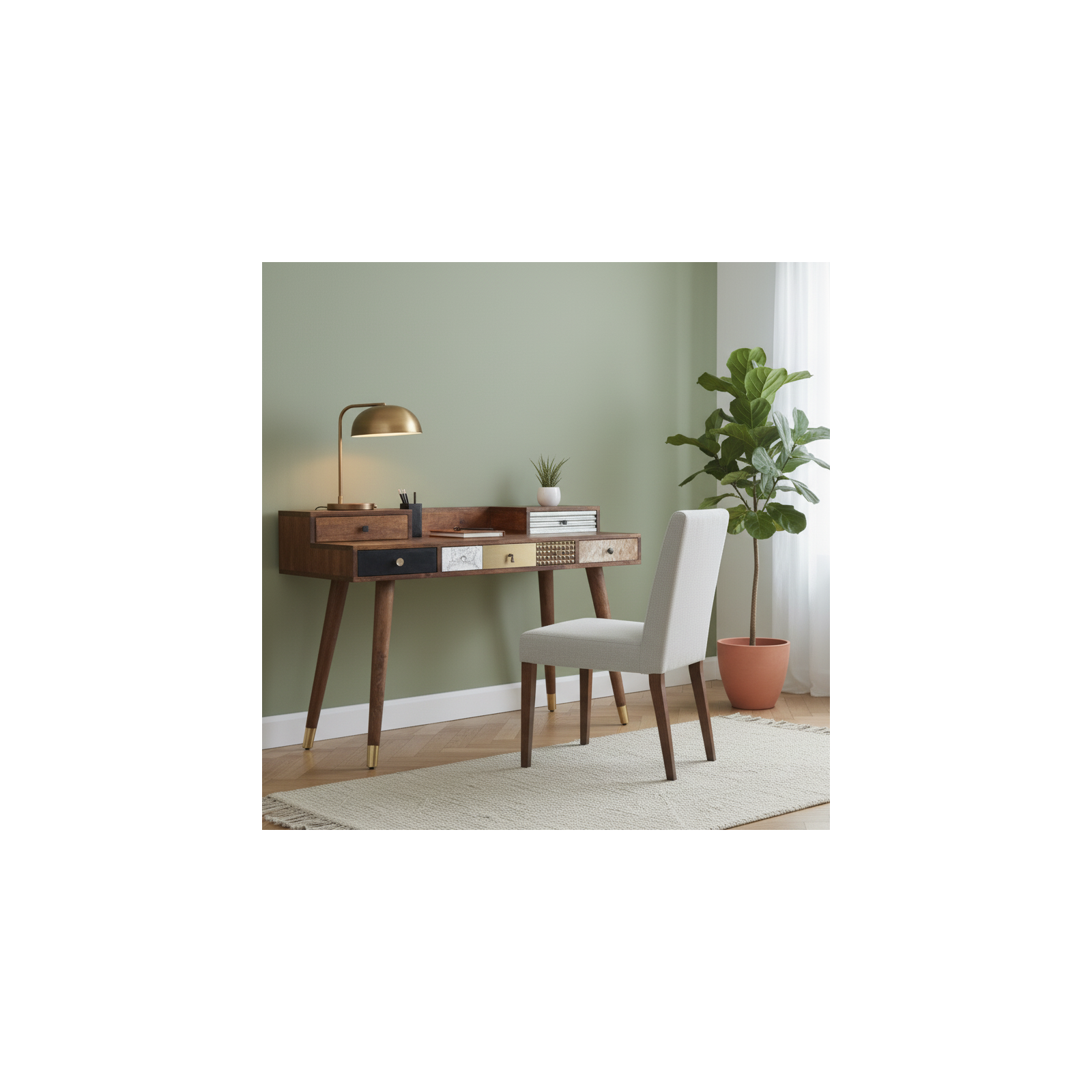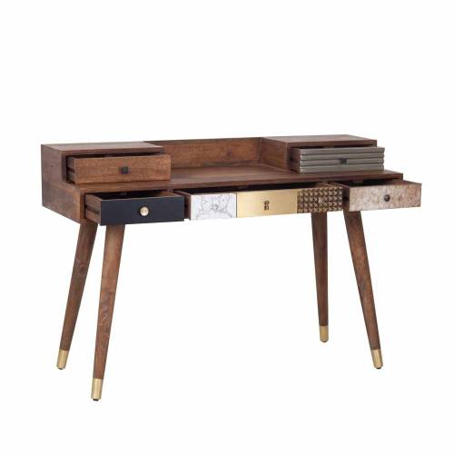 Outre son esthétique originale, ce bureau offre également une fonctionnalité exceptionnelle. Les cinq tiroirs spacieux vous permettent de ranger de manière organisée vos documents, stylos, fournitures de bureau et autres objets essentiels. L'ensemble constitue un espace de travail élégant et fonctionnel qui stimule la créativité et la productivité. Le bureau design de la collection Manguier Mumbai est bien plus qu'un simple meuble de travail, c'est une œuvre d'art fonctionnelle qui élève l'esthétique de votre espace tout en favorisant un environnement de travail propice à la concentration et à l'inspiration. Son style exotique unique et la combinaison de matériaux raffinés en font un choix exceptionnel pour ceux qui recherchent à la fois la beauté et la praticité dans leur espace de travail.
