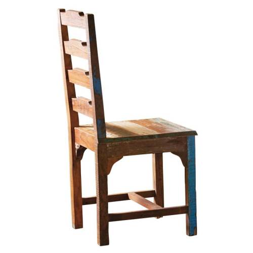 Voici une chaise bois recyclé exotique de la gamme Origine qui ne manque pas de piquant avec ses couleurs provenant de la peinture qui ornait autrefois des bateaux et des batiments, sur lesquels le bois utilisé fut récupéré.
