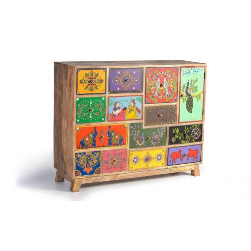 Ce chiffonnier bois est peint à la main de motifs exotiques aux couleurs vives. Ce meuble déco au style ethnique dispose de 14 tiroirs de rangement.