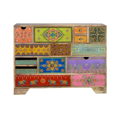 Ce beau chiffonnier design dispose de 14 tiroirs pour vous permettre de tout ranger. Un meuble déco ethnique orné de motifs exotiques aux couleurs vives.