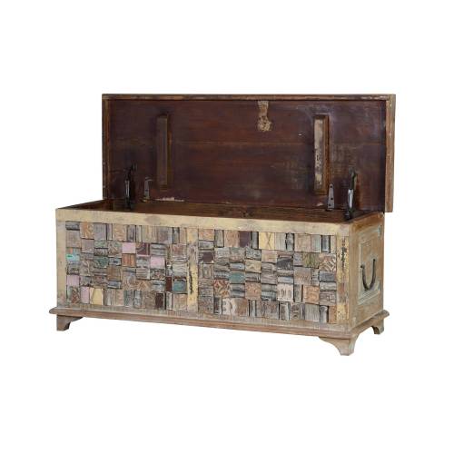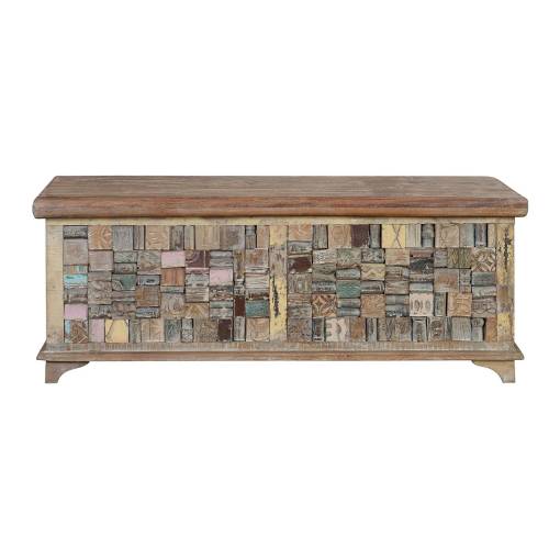 Ce coffre rangement interieur est en bois recyclé. Ce meuble déco écologique donne une seconde vie au bois avec un design unique.