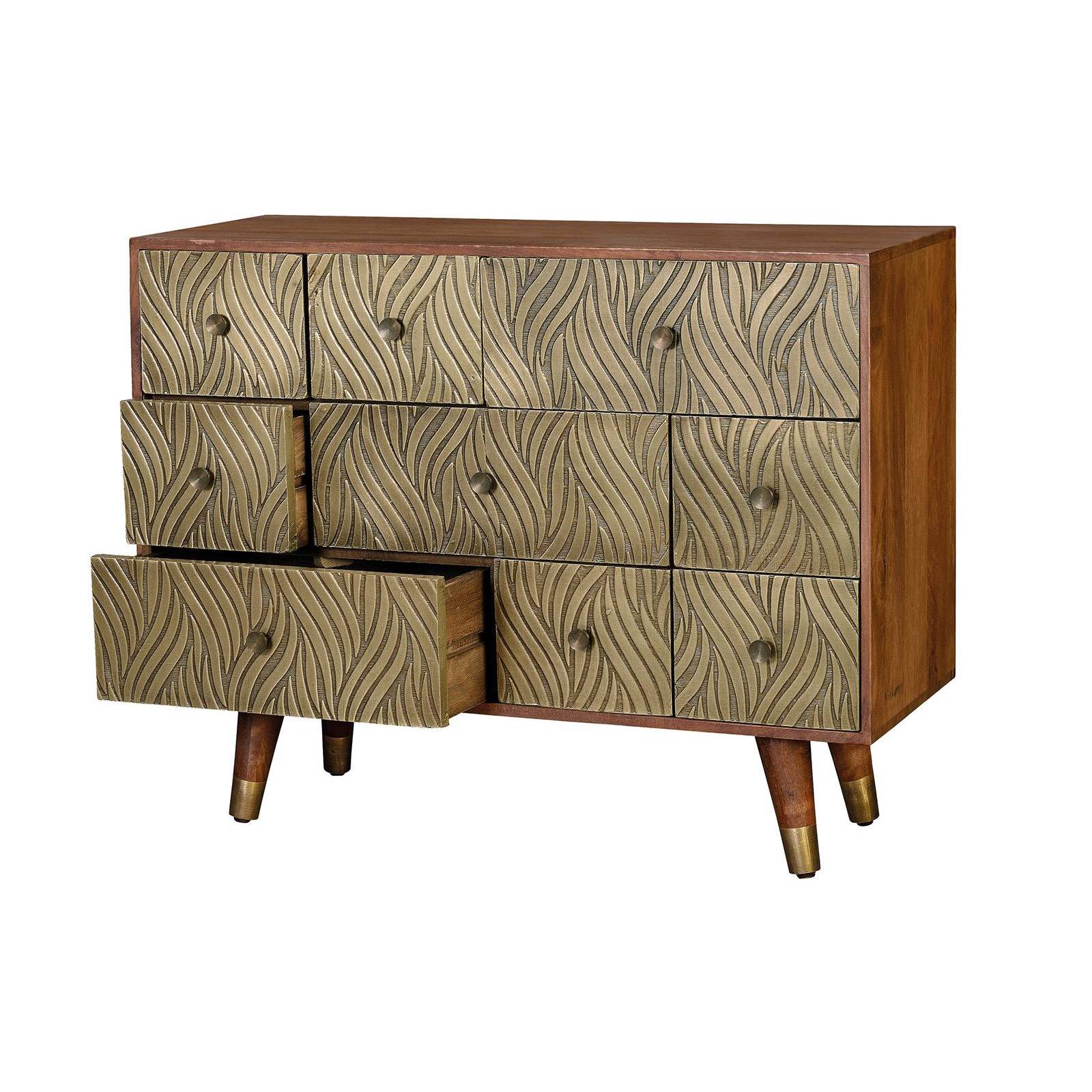 Craquez pour cette incroyable commode bois et metal en manguier massif. Les tiroirs de ce meuble déco sont ornés de bronze finement sculpté.