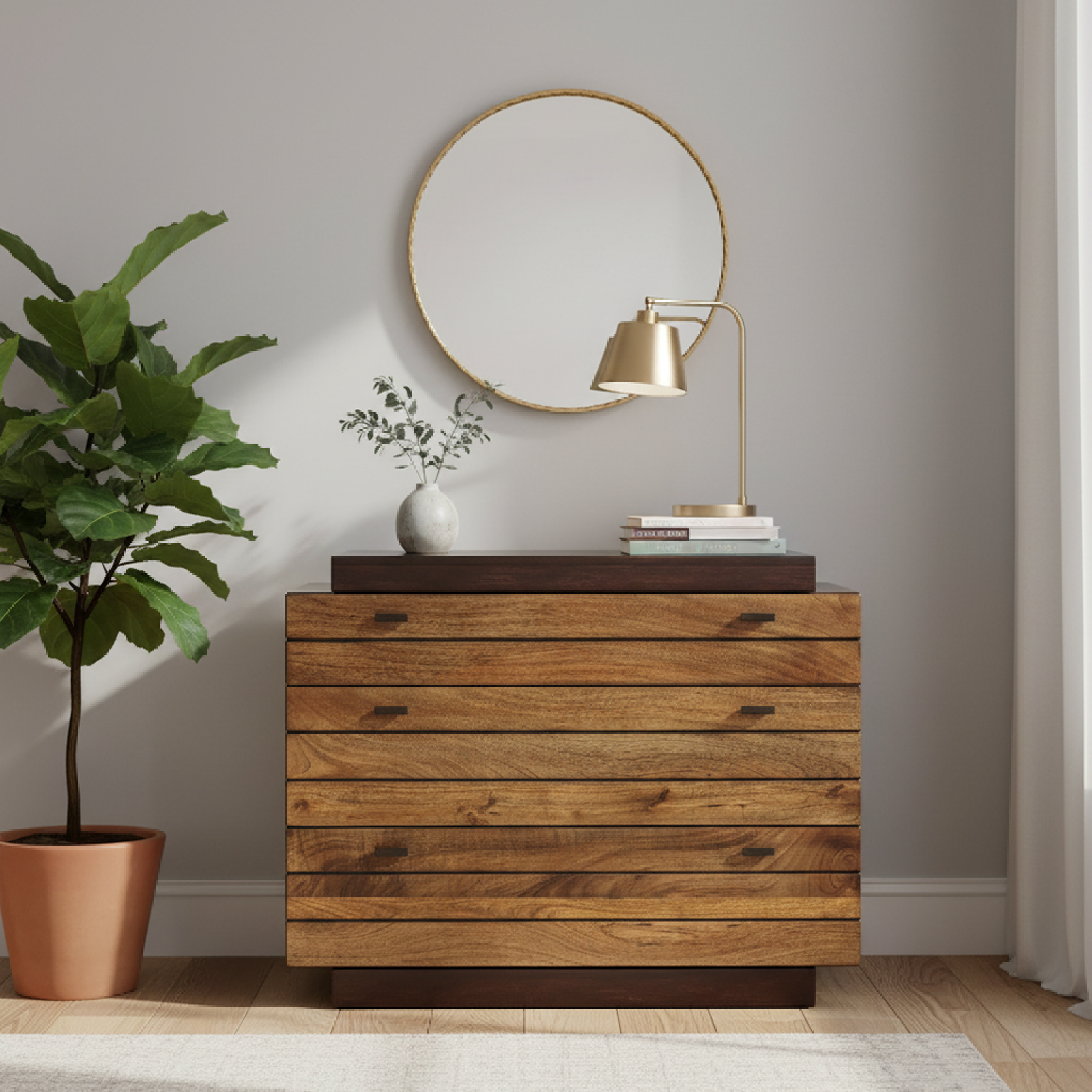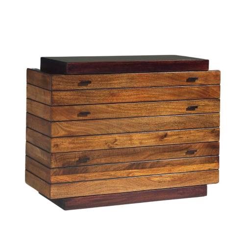 La combinaison de ces deux bois exotiques crée un contraste visuel captivant. Le manguier, avec sa teinte claire et ses motifs de grain subtils, apporte une sensation de légèreté et d'ouverture à la commode. Le sheesham, quant à lui, offre une couleur plus foncée et une texture prononcée, ajoutant une dimension chaleureuse à l'ensemble.