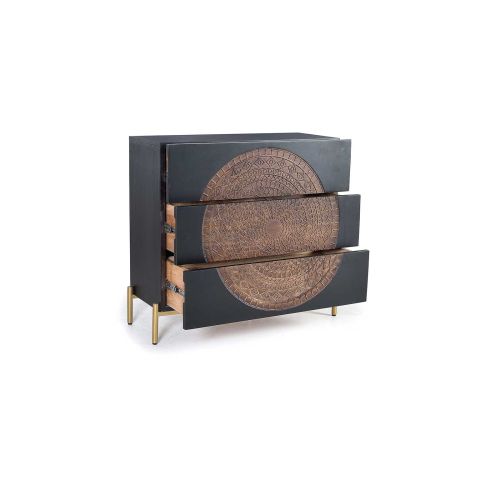 Fabriquée en manguier massif, un bois exotique réputé pour sa solidité et sa beauté naturelle, cette commode est à la fois robuste et résistante. Sa texture chaleureuse et ses riches nuances de couleurs ajoutent une touche d'authenticité et de caractère à votre espace de vie. Le piétement en métal doré apporte une touche de glamour et de raffinement à l'ensemble. Cette combinaison harmonieuse du métal et du bois confère à la commode un style exotique et moderne.