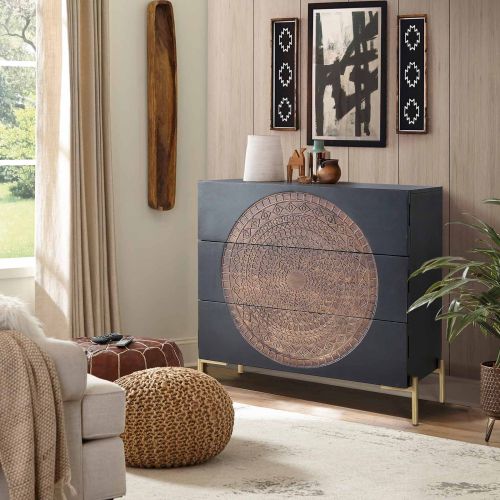 La commode en manguier est un meuble remarquable qui combine l'élégance du bois de manguier massif à la sophistication d'un piétement en métal doré.