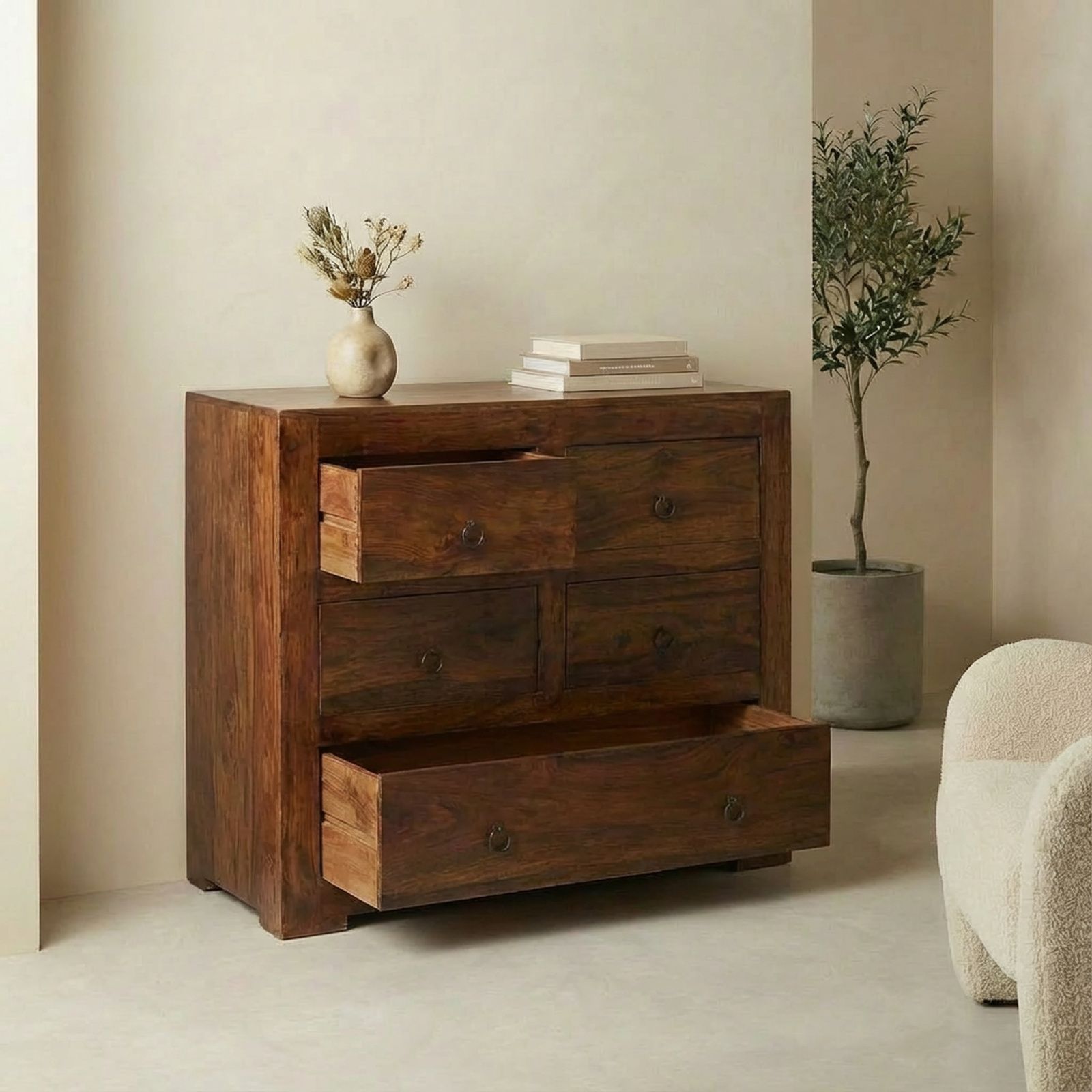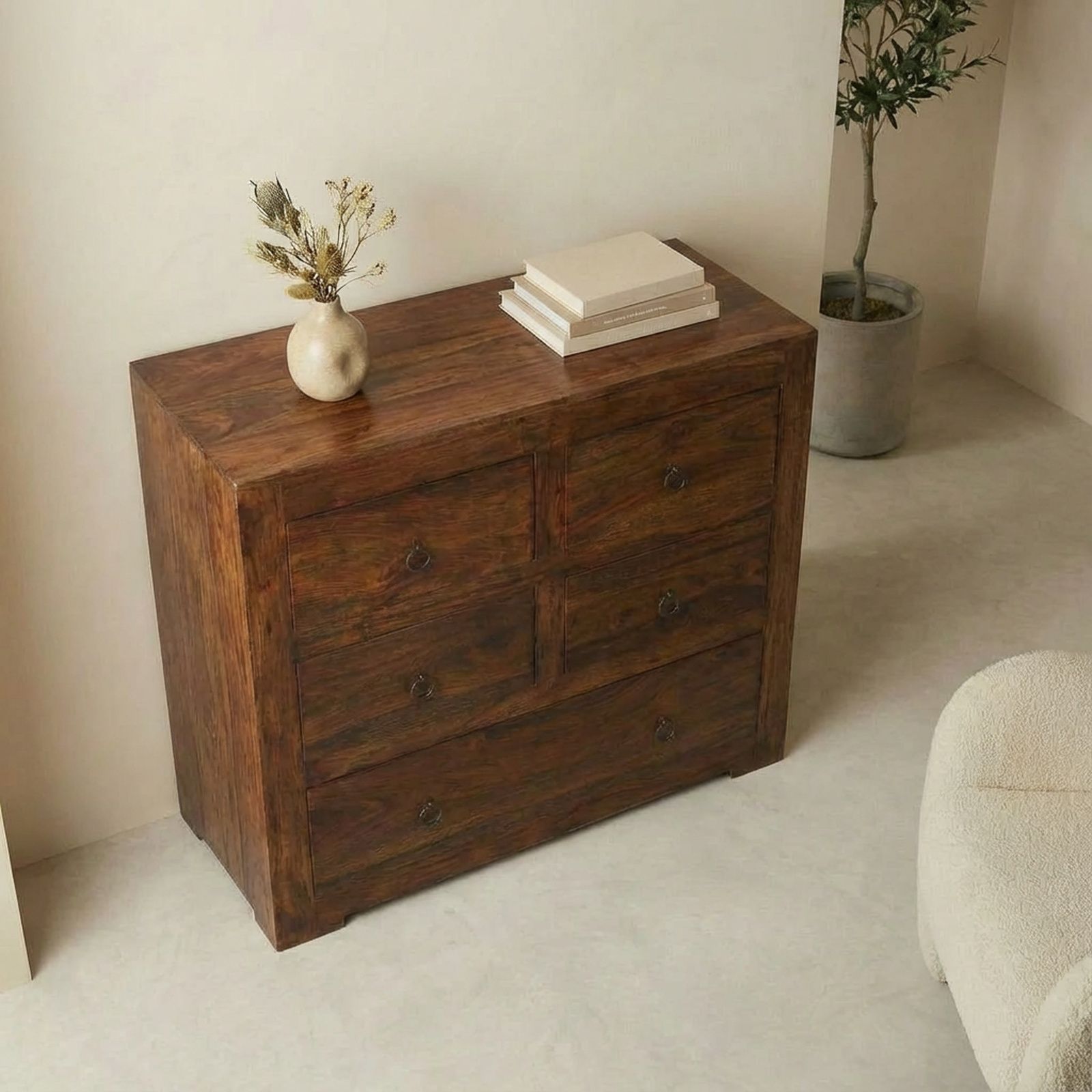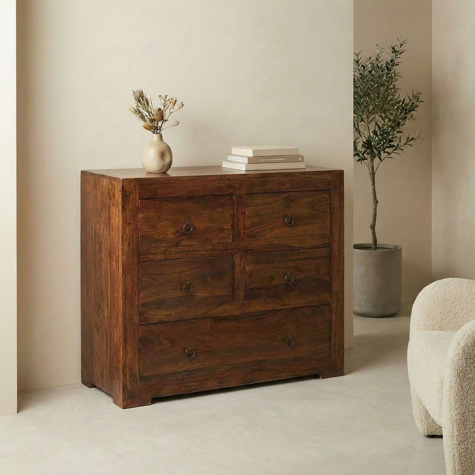 Cette jolie commode palissandre massif au design soigné possède cinq tiroirs ornés de petites poignées en métal évoquant le mobilier japonais. Disposée dans une chambre à coucher, elle vous permettra de ranger votre linge ainsi que vos accessoires telles que vos ceintures, et ceci de façon rationnelle.