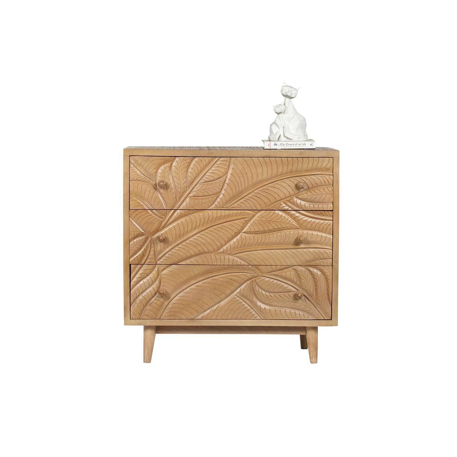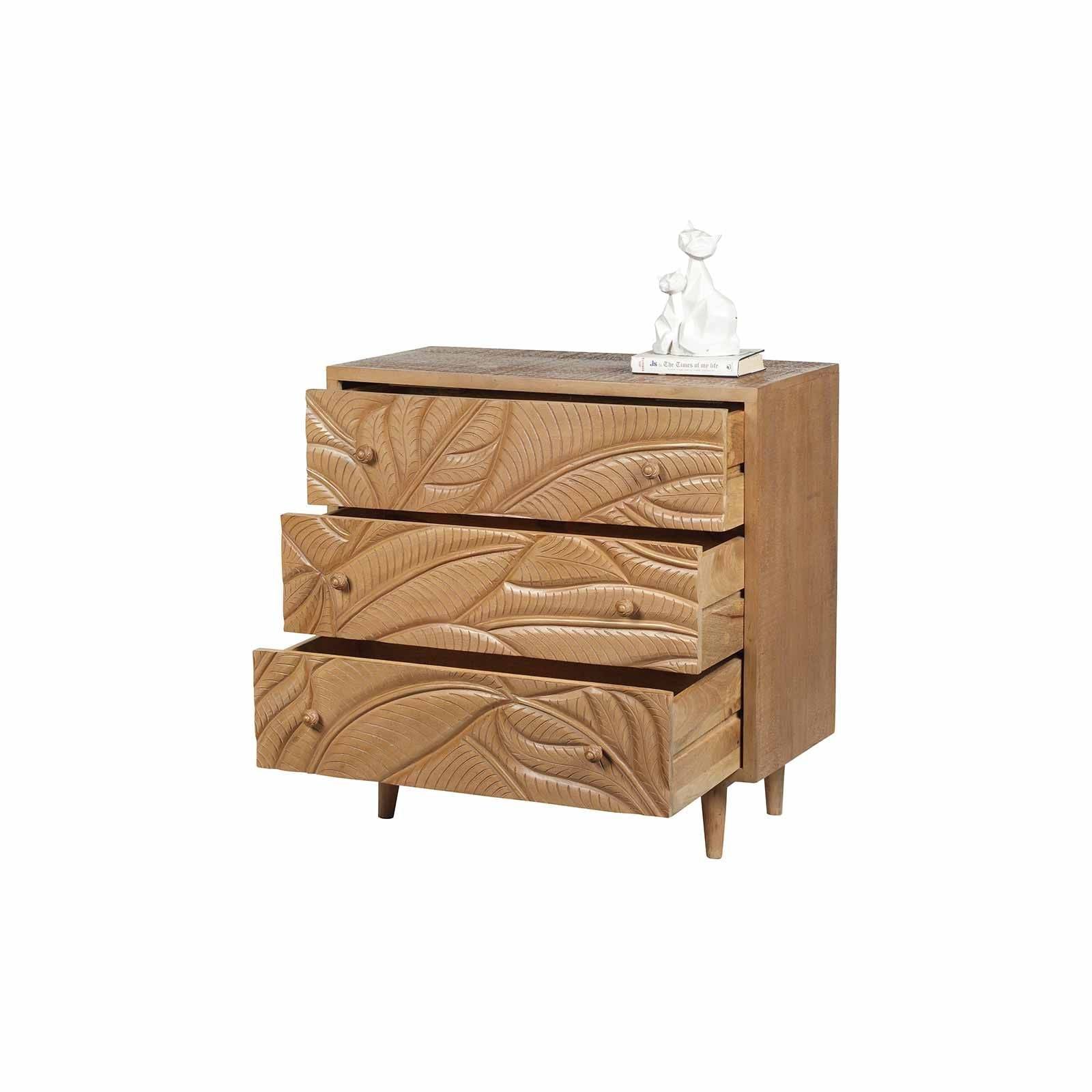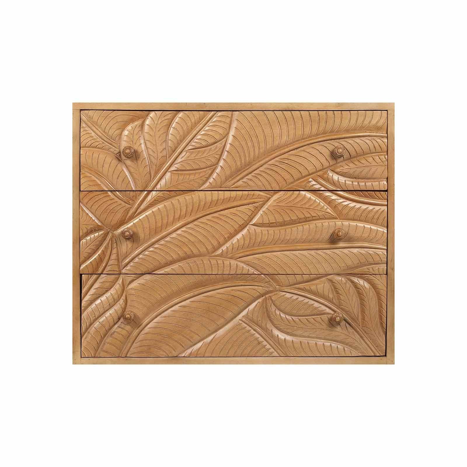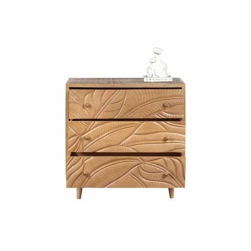 La commode sculptée 3 tiroirs est conçue avec une combinaison de manguier massif et de MDF vous offrant rangement et esthétique dans votre intérieur.