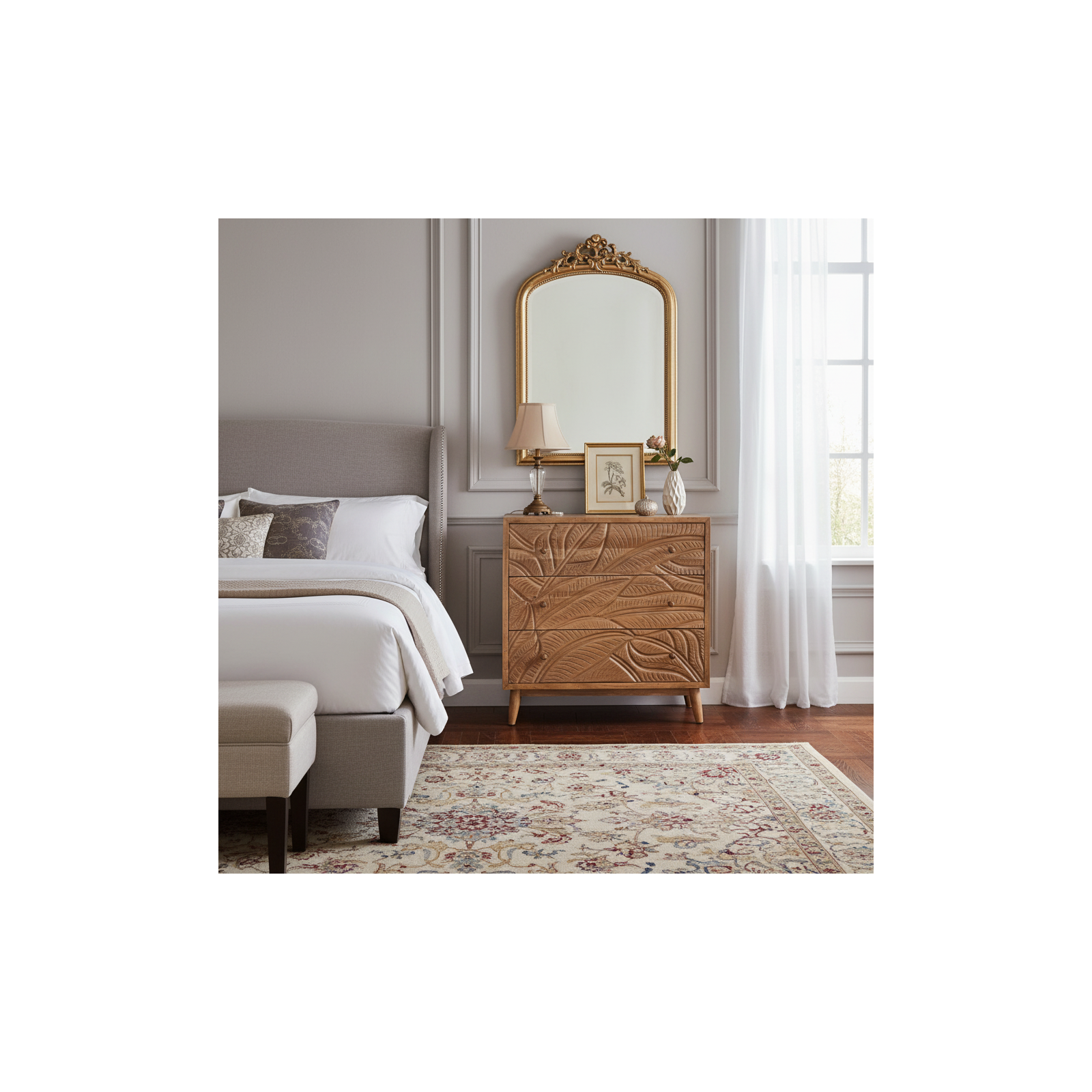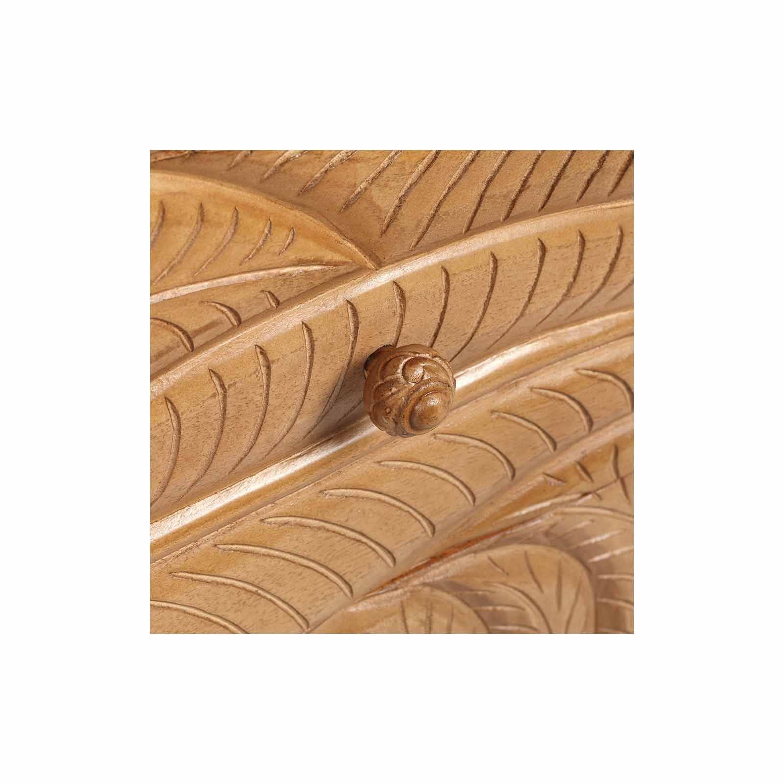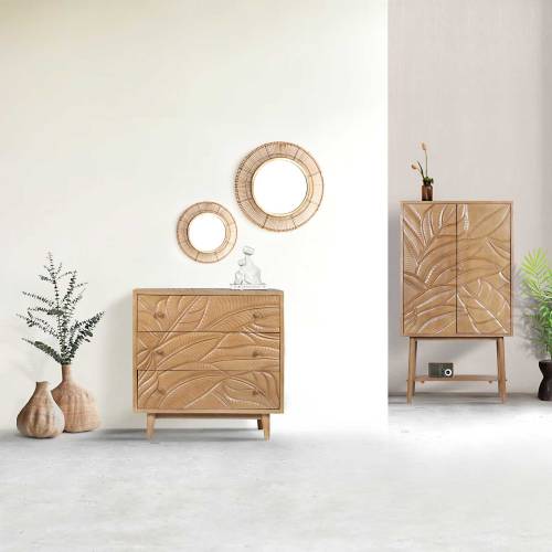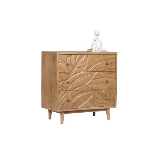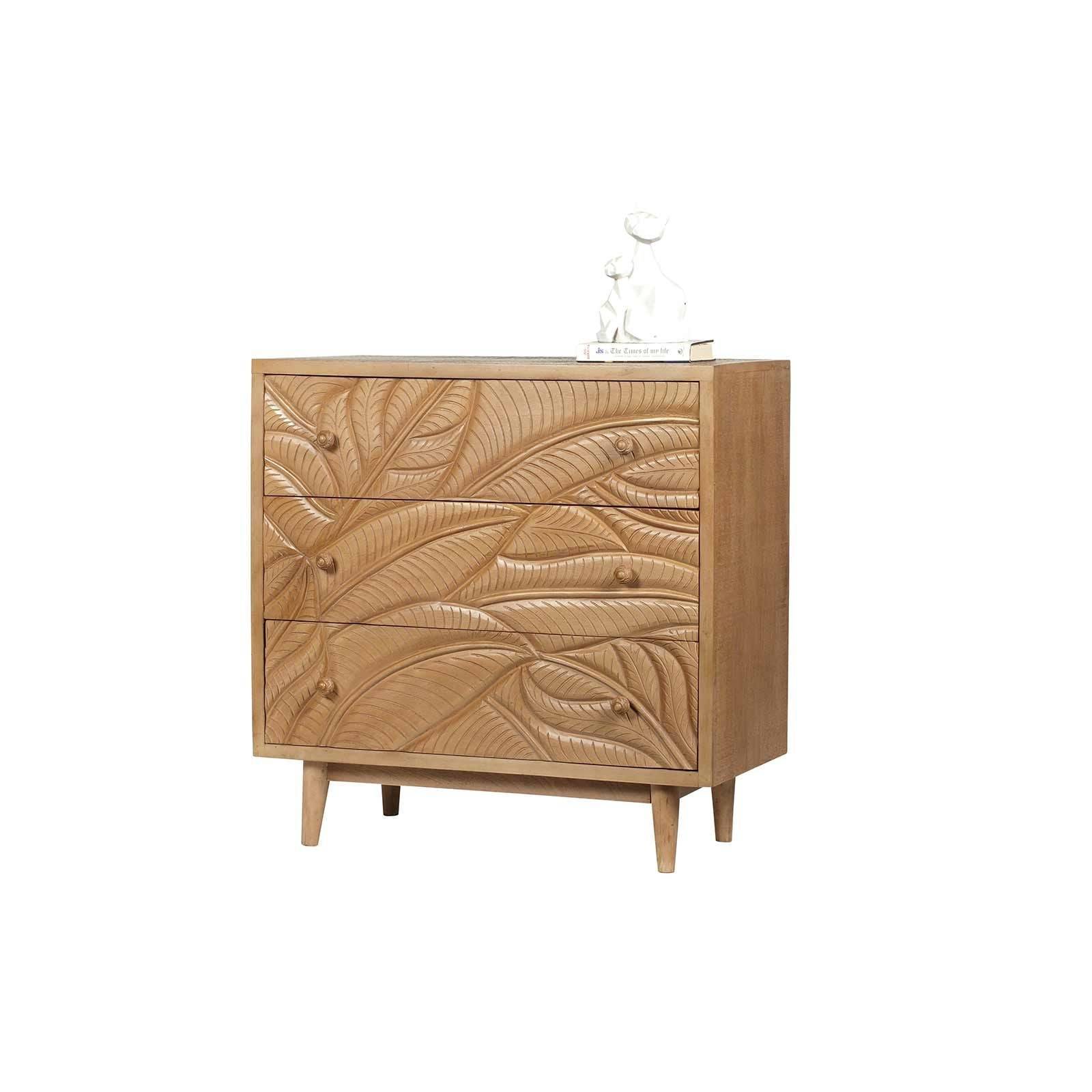 La commode sculptée 3 tiroirs est conçue avec une combinaison de manguier massif et de MDF vous offrant rangement et esthétique dans votre intérieur.