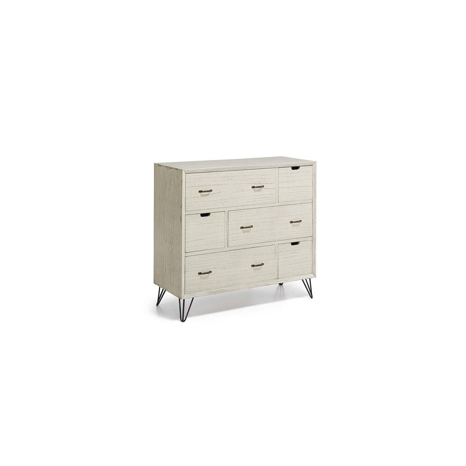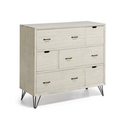 La commode Malaga est atypique avec sa couleur crème, sa finition cérusée et ses pieds en métal. L’inspiration industrielle est bien présente dans ce petit meuble de rangement ! Mais avec sa teinte crème et son veinage apparent, cette commode style industriel est vraiment unique en son genre. Vous avez peu de chance de trouver un autre modèle lui ressemblant ! Son petit truc en plus : sa façade asymétique au rendu très moderne et ses poignées en métal.