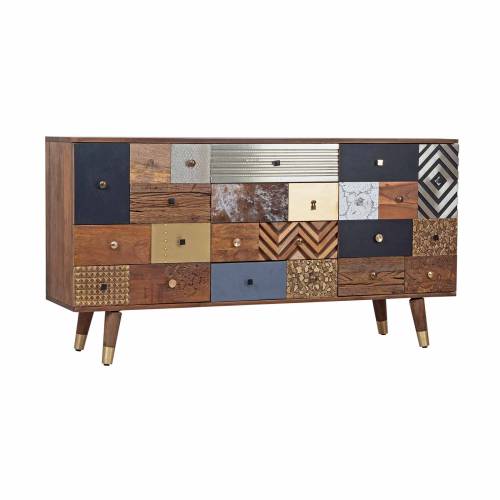 Ce qui distingue cette commode, c'est sa façade multi matériaux, une véritable œuvre d'art en soi. Le bois sculpté révèle des motifs complexes et envoûtants qui racontent une histoire d'habileté artisanale et d'inspiration culturelle. Le contraste entre le bois sculpté, le cuir de vache, le métal et le bronze ciselé est à la fois audacieux et harmonieux. Le cuir de vache apporte une touche de luxe, une texture captivante et une sensation tactile agréable, tandis que les détails métalliques en bronze ciselé ajoutent une note de sophistication qui attire le regard. Mais cette commode n'est pas seulement une œuvre d'art visuelle. Elle offre également une fonctionnalité exceptionnelle grâce à ses multiples tiroirs spacieux.