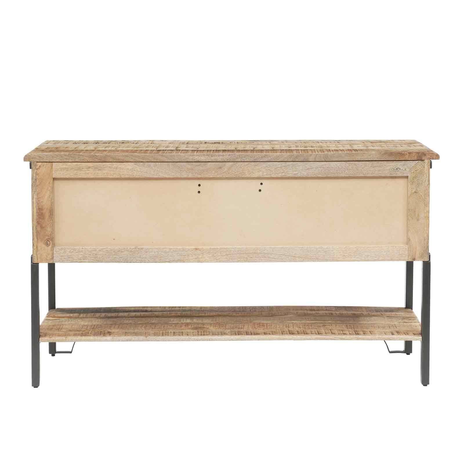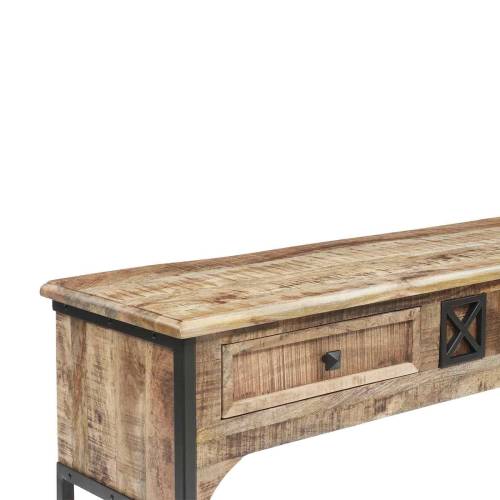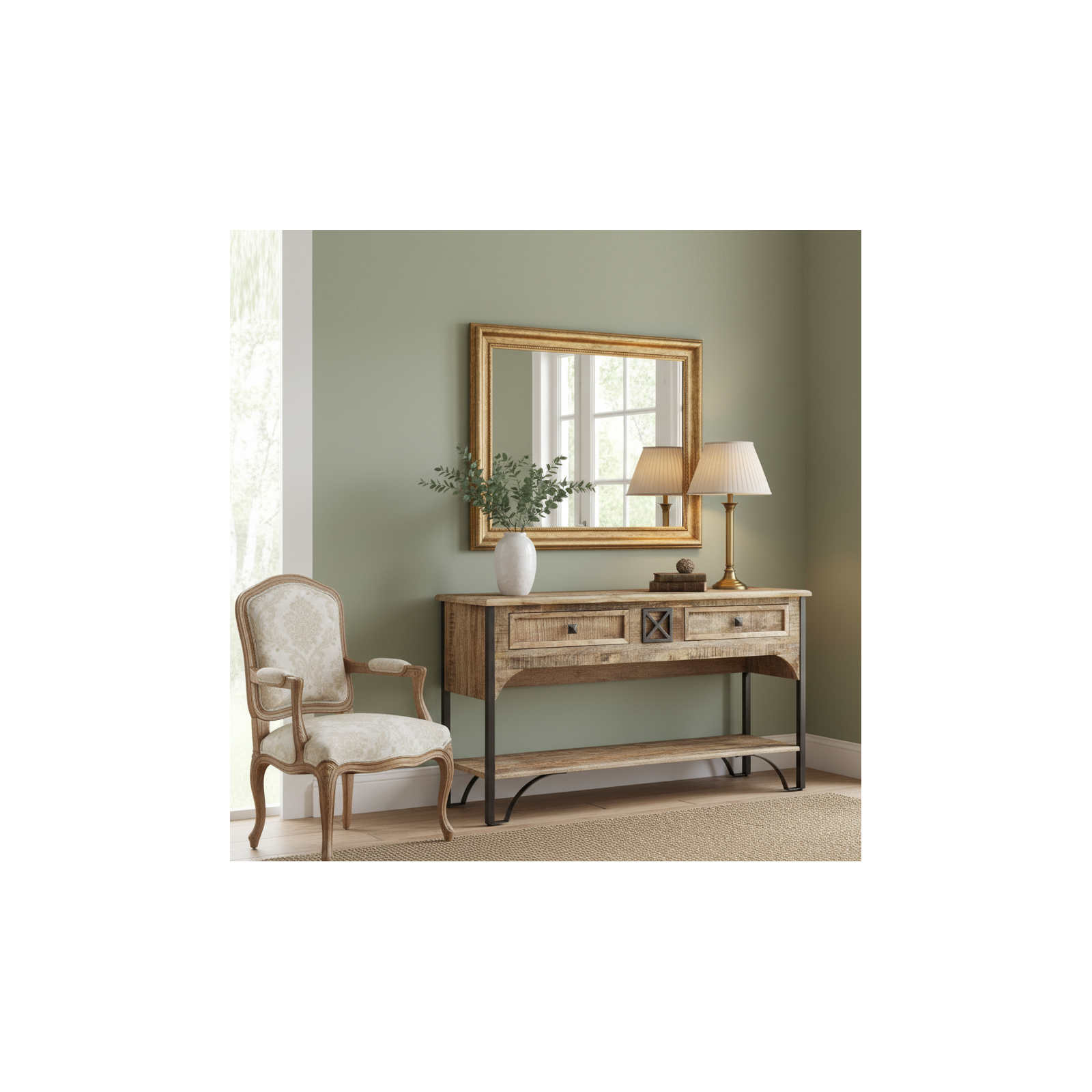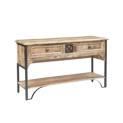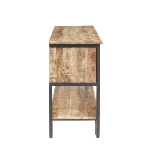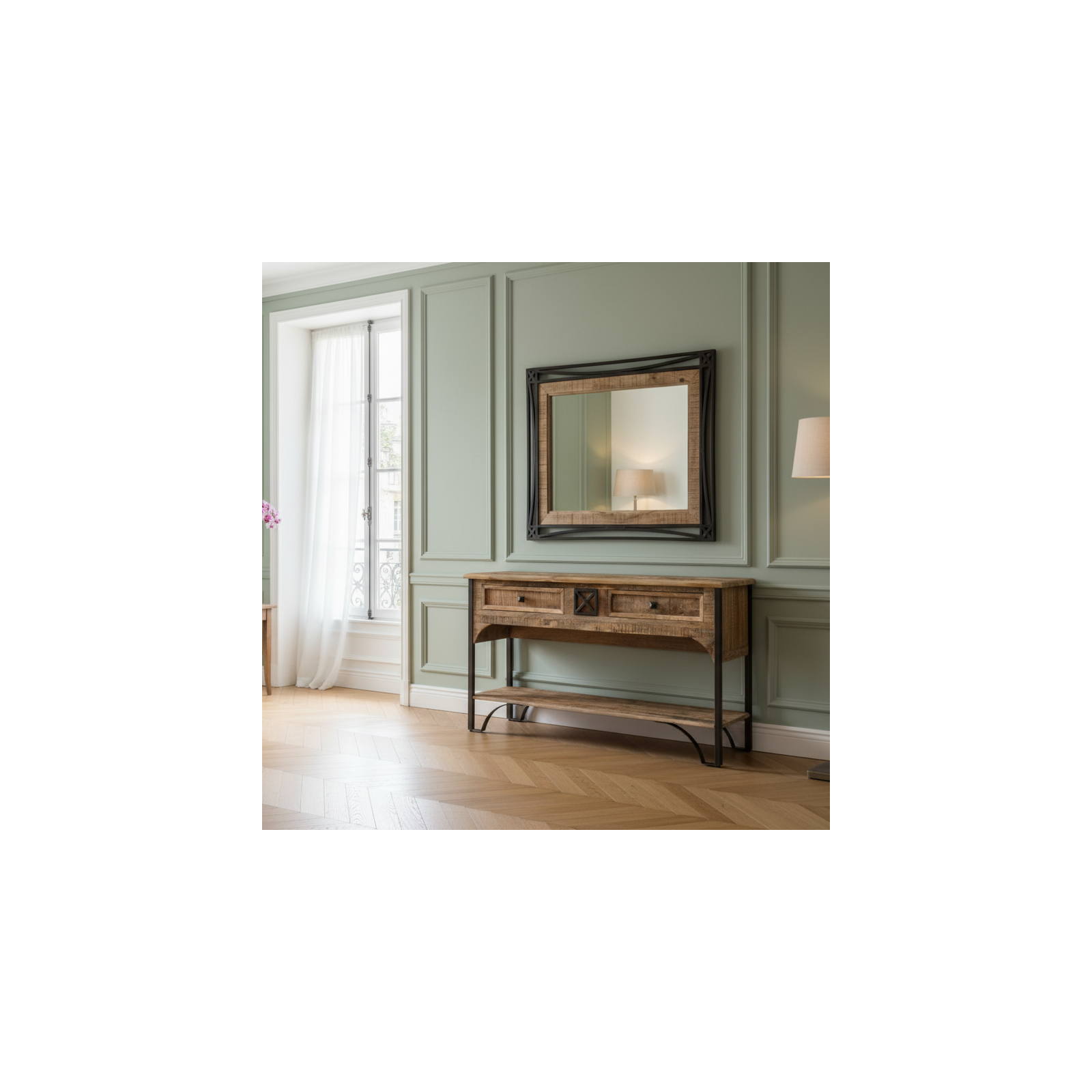 Les dimensions équilibrées de la console offrent un charme discret, en faisant un ajout élégant à n'importe quel espace de votre intérieur. La combinaison ingénieuse de matériaux nobles tels que le manguier massif et le métal confère à cette console un caractère contemporain et industriel. Les pieds en métal robustes garantissent une stabilité exemplaire, tout en apportant une touche moderne et audacieuse à l'ensemble. Les deux tiroirs de la console offrent un espace de rangement pratique, tout en ajoutant une dimension fonctionnelle à son design élégant.